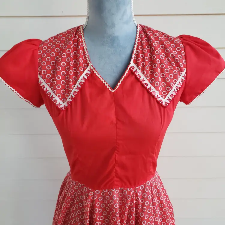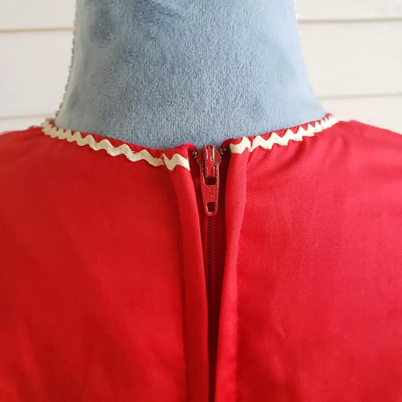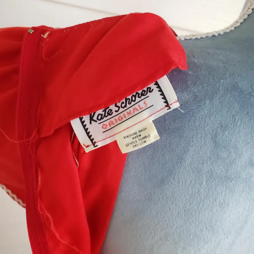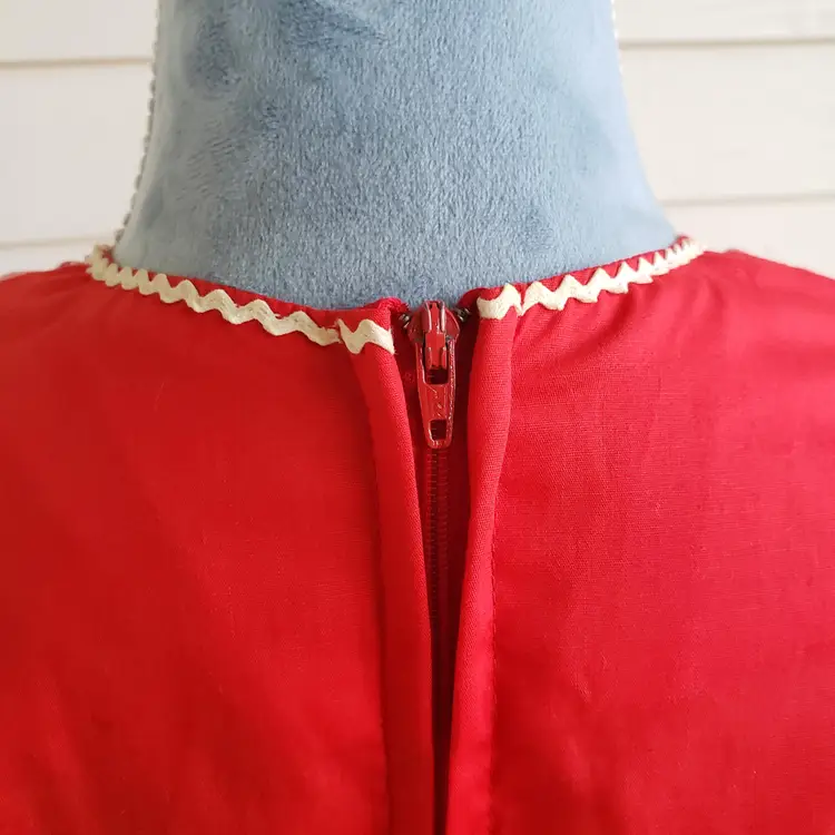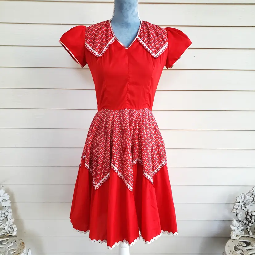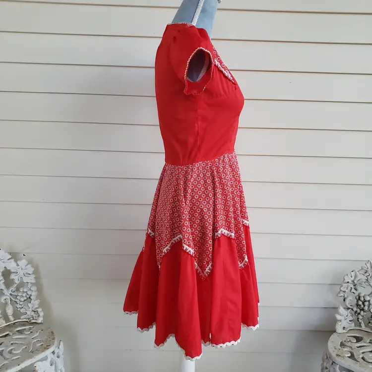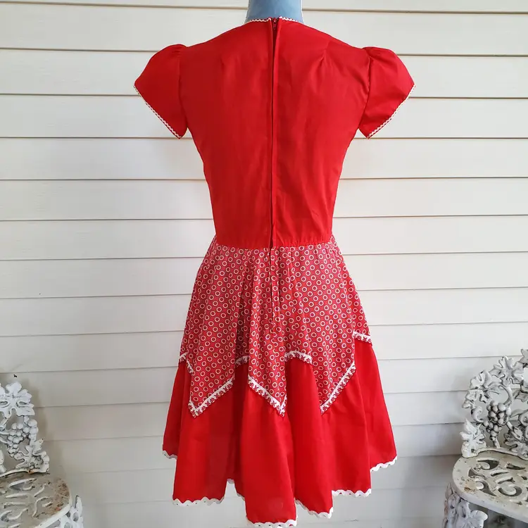 This is for a cute red cotton square dancing dress. Tag says Kate Schorer Originals. Machine washable. There is no size tag but it looks like it is more of a small. Please check measurements. There is a YKK zipper partially down the back. Dress looks to be in good condition. I am not noticing any issues except for some loose thread I trimmed off in the unfinished seams on the inside. Material does not stretch.