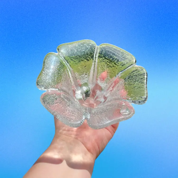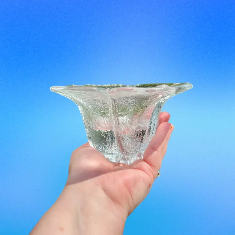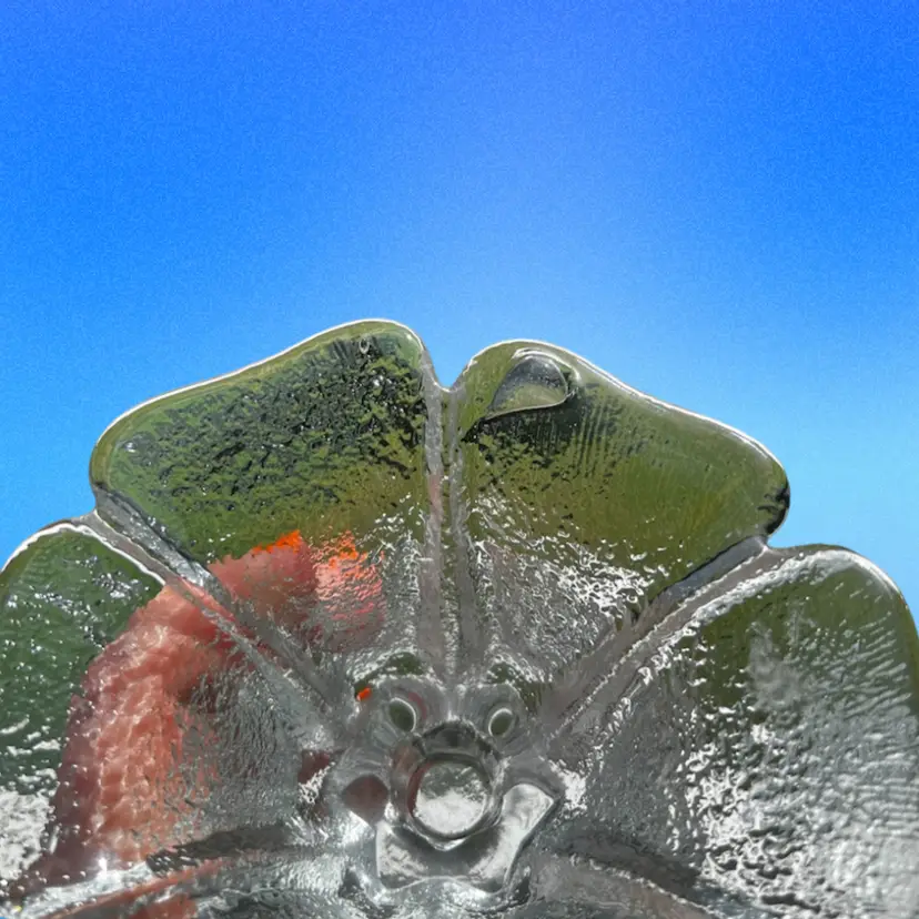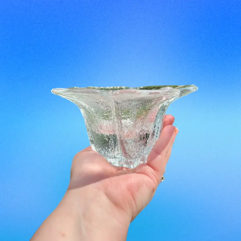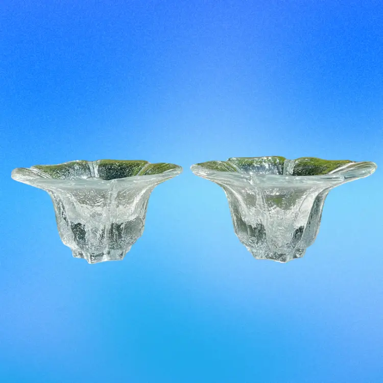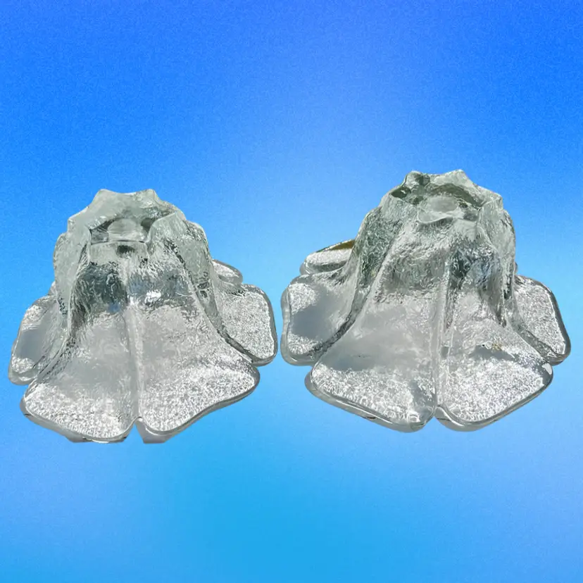 From the 1977 Blenko catalog. These babies are hefty but beautiful. No chips or cracks, but there is a large air bubble on one of the candle holders. Air bubble can be seen in the last photo.