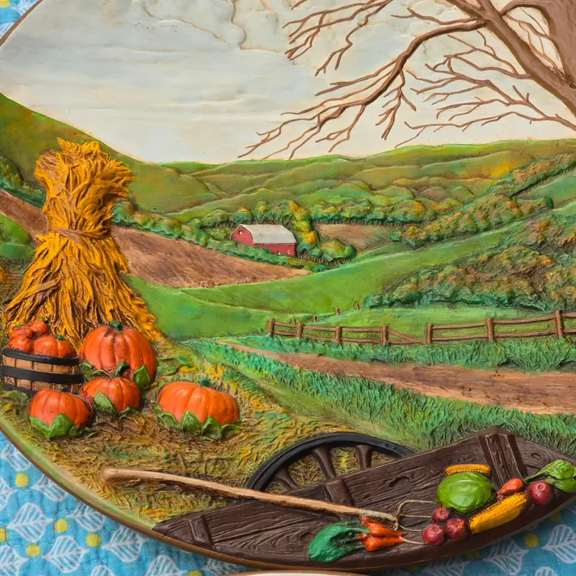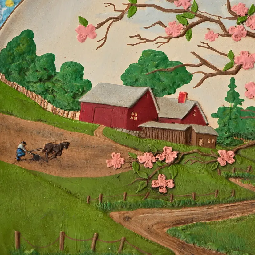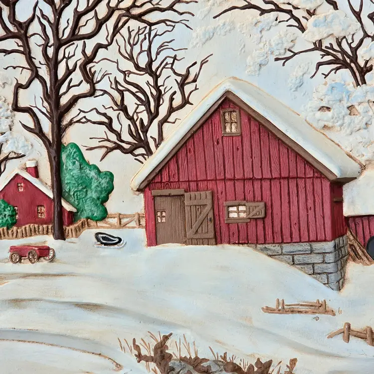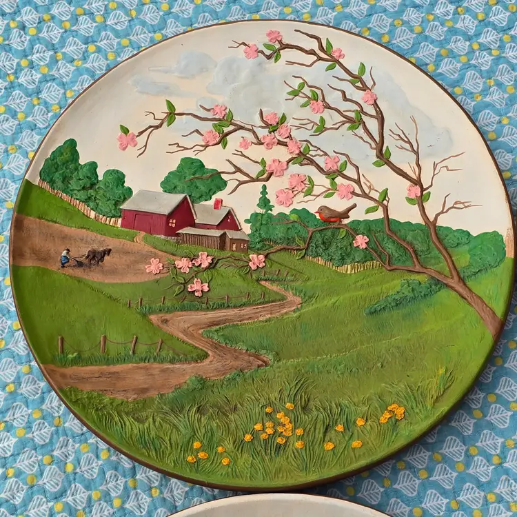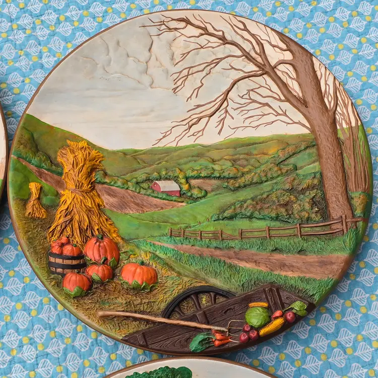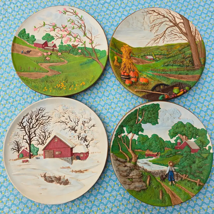 These fun wall plates depict the same farm from different angles throughout the seasons.