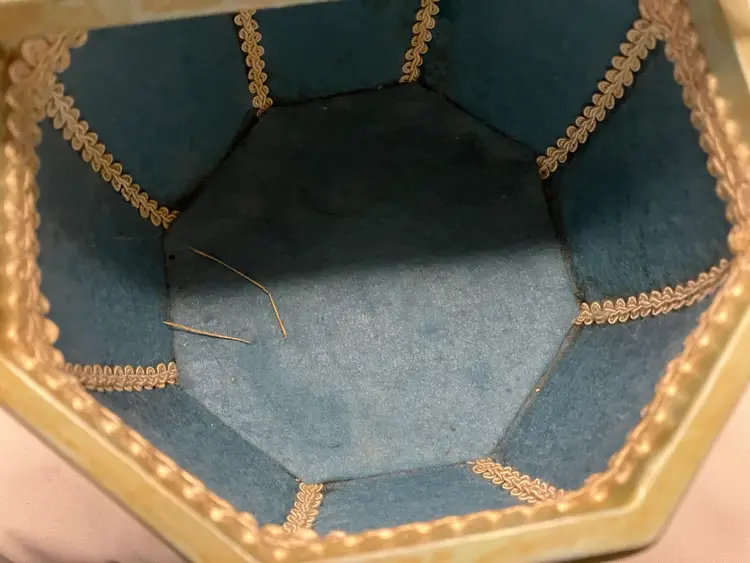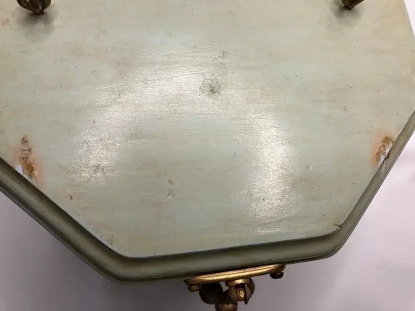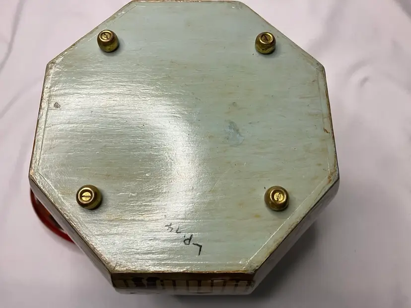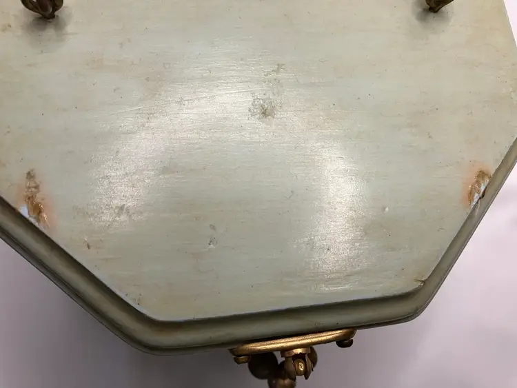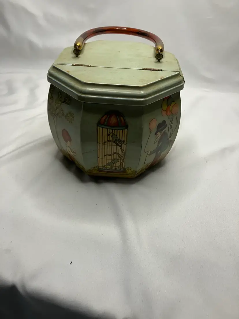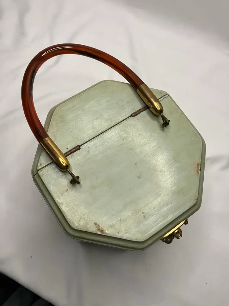 Cute 1970’s Decoupage Wooden Purse with tortoise lucite handle. The interior is lined. The top does have two marks in the paint from the handle. The bottom is signed LP 74. Approximately 5” H.