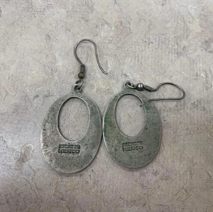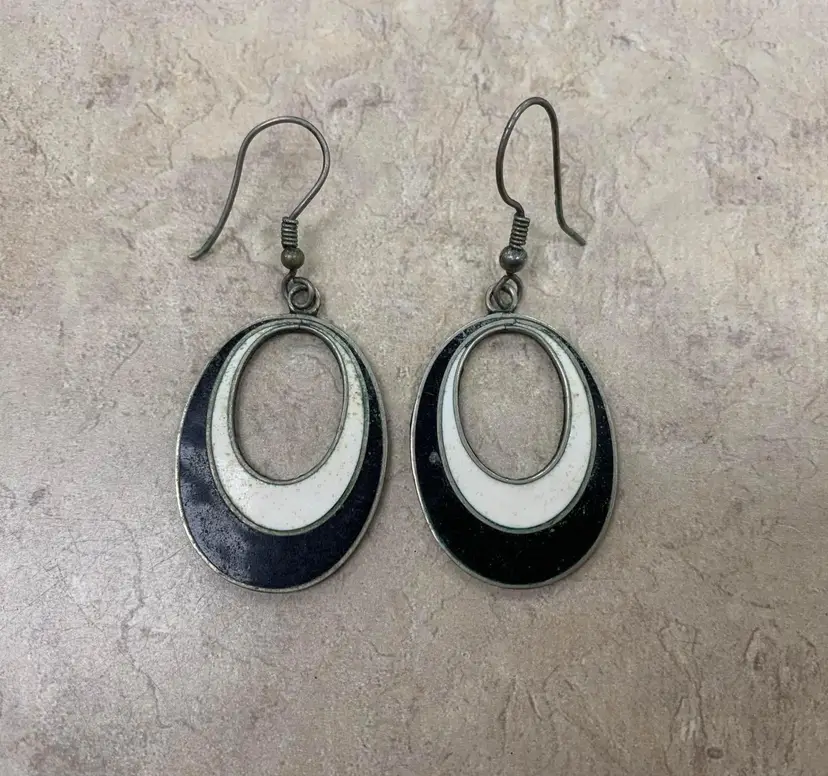 Great condition; in need of a deep clean and one of the hooks is bent slightly, but still wearable. Black and white enamel circular dangling earrings. French hooks. Earring drop is 2 inches. Charm is 1 and 1/4 inches long, 1 inch wide.