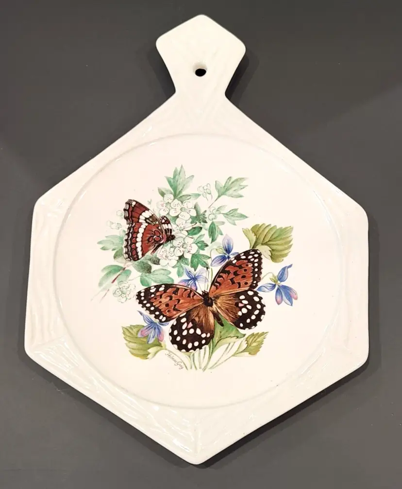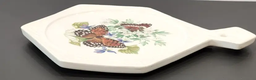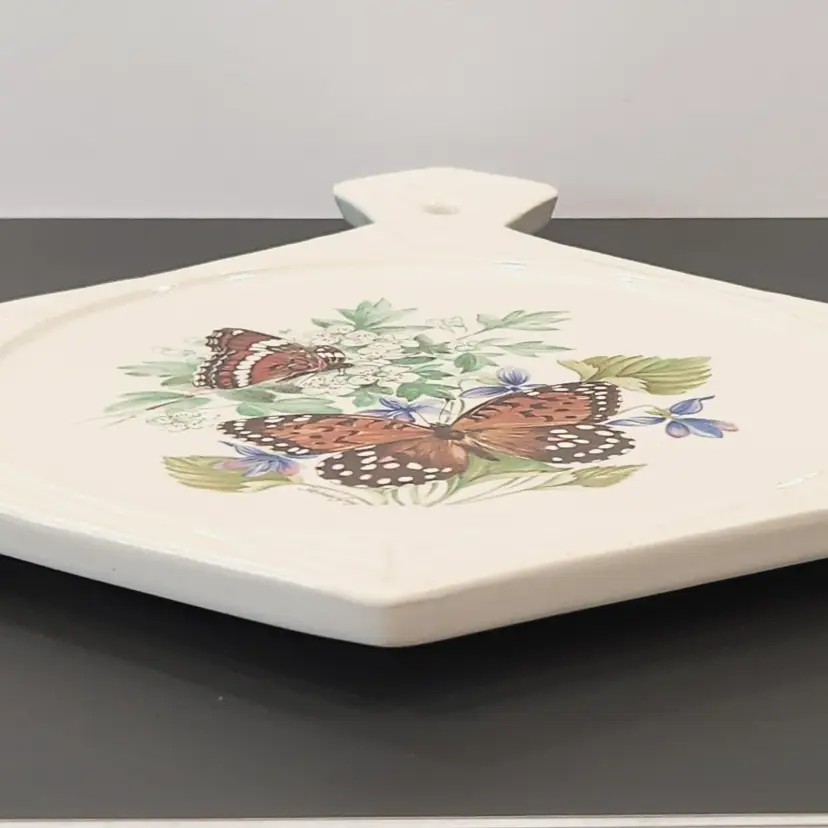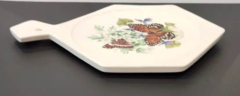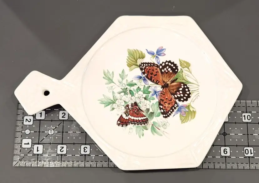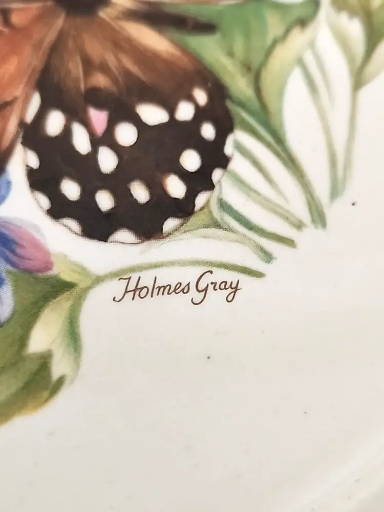 Excellent pre-owned condition. No chips and design has no scratches or wear. Monarch butterfly on flowers signed Holmes Gray. One dark spot on front bottom left edge of trivet area that appears to be paint and some staining on bottom edge (see photos). It is marked USA 61 on the back and has a silver sticker but the printing on it is worn off. Measures approx 9.75" long and 7" wide.