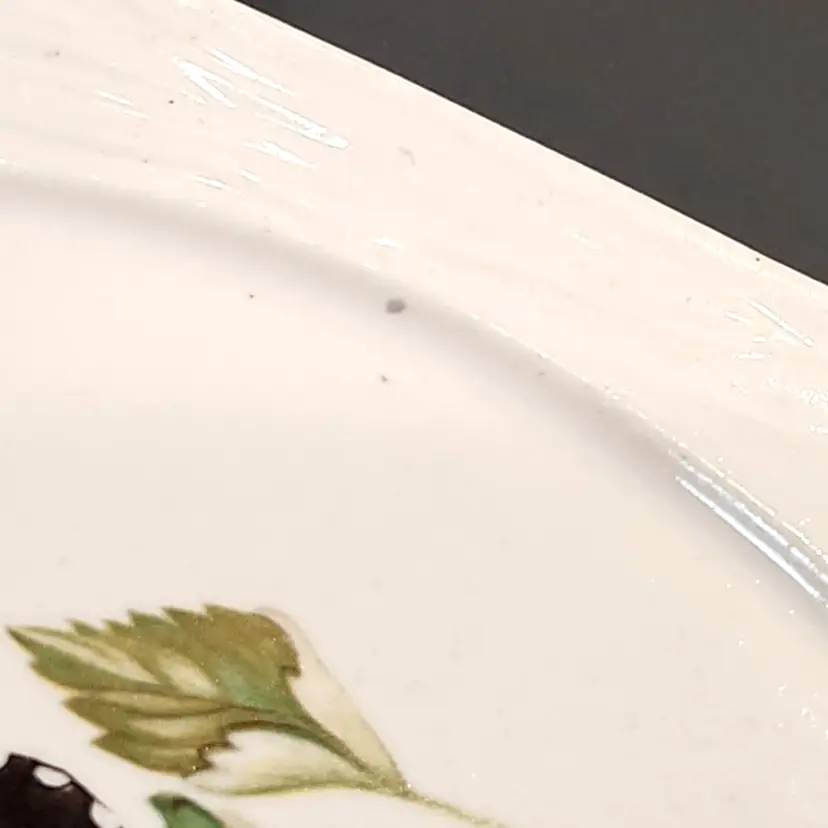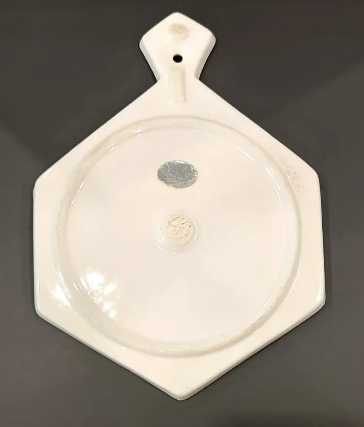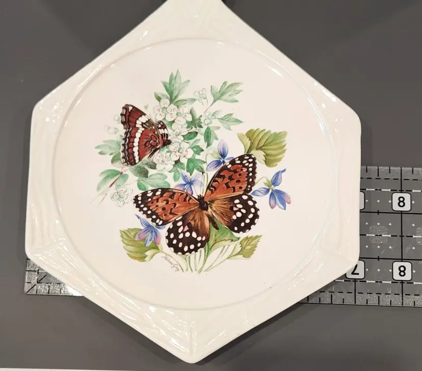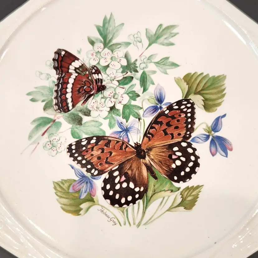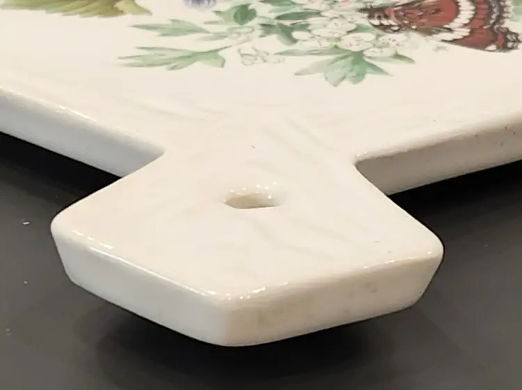 Excellent pre-owned condition. No chips and design has no scratches or wear. Monarch butterfly on flowers signed Holmes Gray. One dark spot on front bottom left edge of trivet area that appears to be paint and some staining on bottom edge (see photos). It is marked USA 61 on the back and has a silver sticker but the printing on it is worn off. Measures approx 9.75" long and 7" wide.