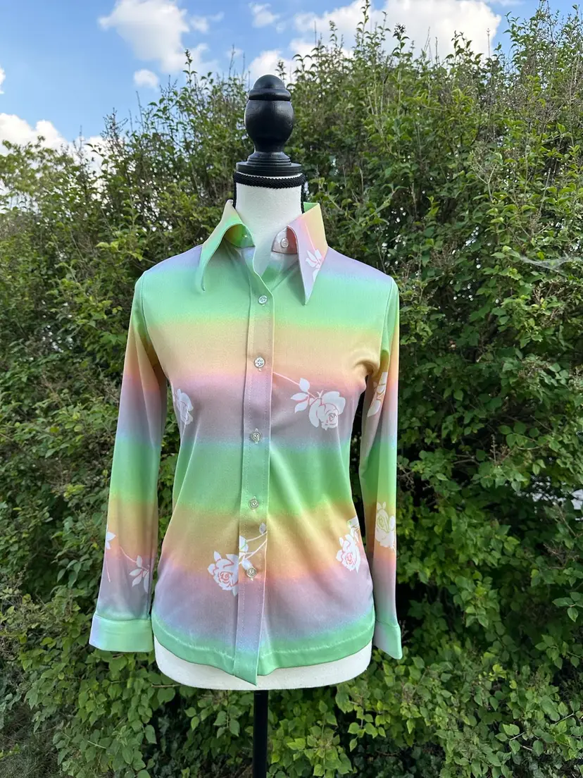 Pastel ombré rainbow blouse with white rose novelty print and dagger collar. No tags, stretchy poly, excellent vintage condition. Blouse is clean and ready to wear.