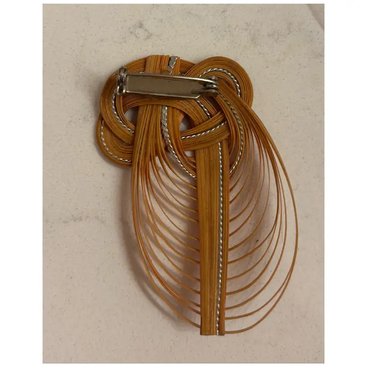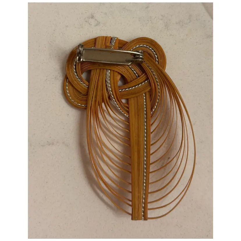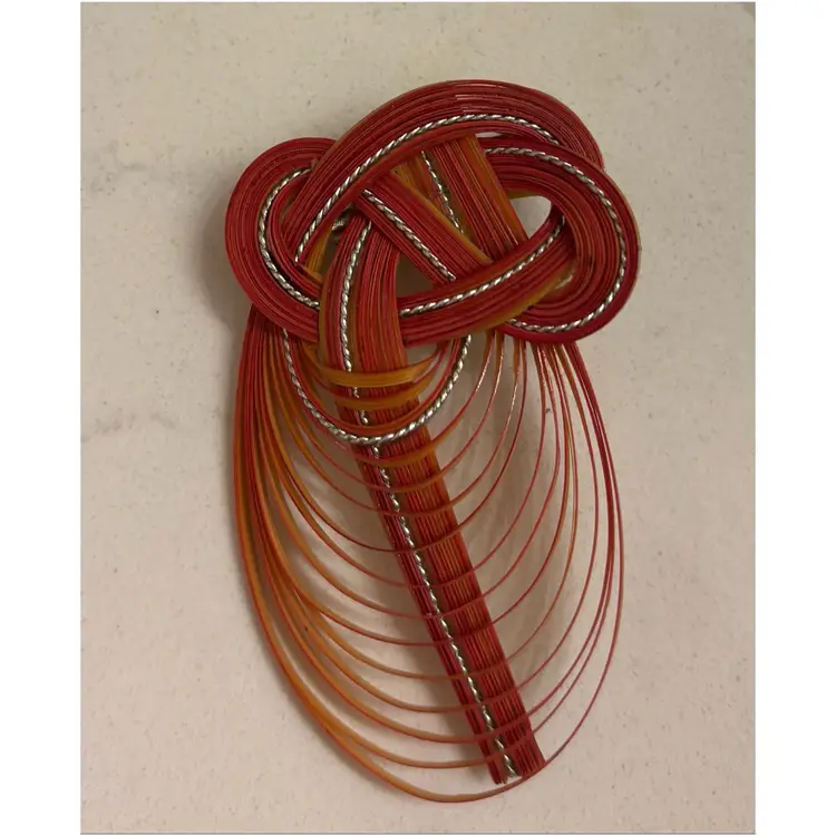 Intricate knotted design. Vibrant red and orange tones with silver accent. Elegant statement piece.