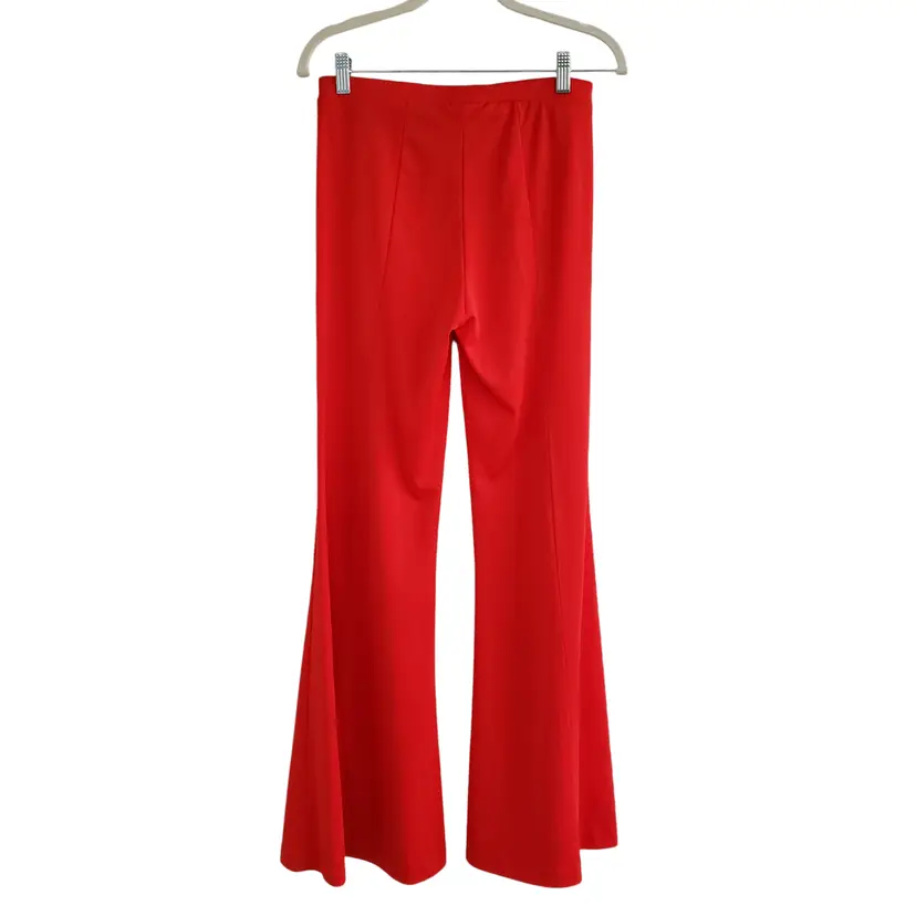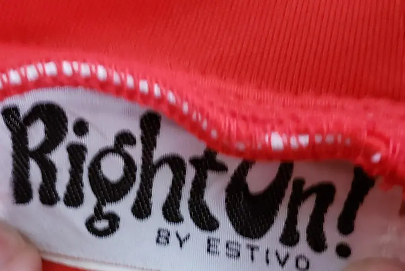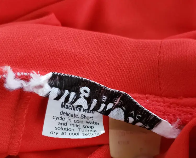 These are highly collectible. Somewhere out there is a matching top! Now the color in the photos looks more red. These seem more orange/ red to me in the light. Brand is Right On! by Estivo. Machine washable. 100% Polyester. Fabric is very stretchy. Tagged a size 9/10. These are in great condition. I do see some fraying on the sides of the Right On tag. Elastic waist still stretches.