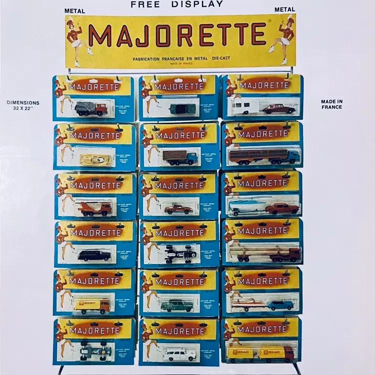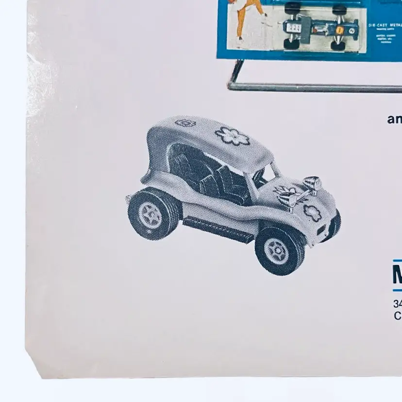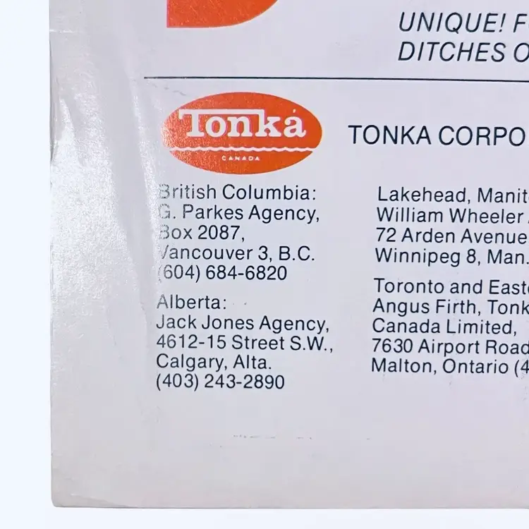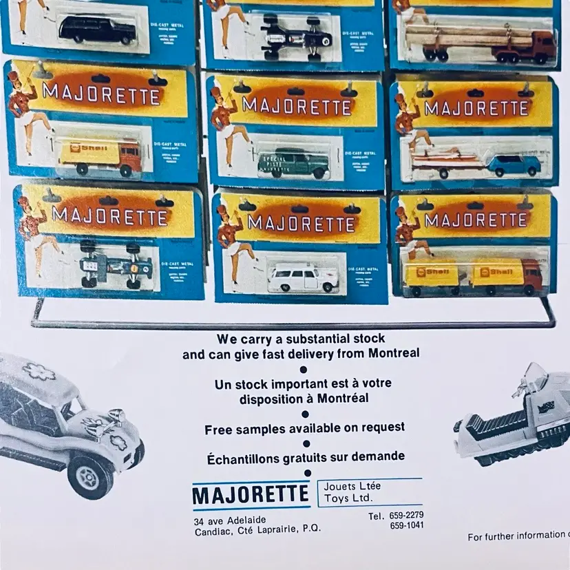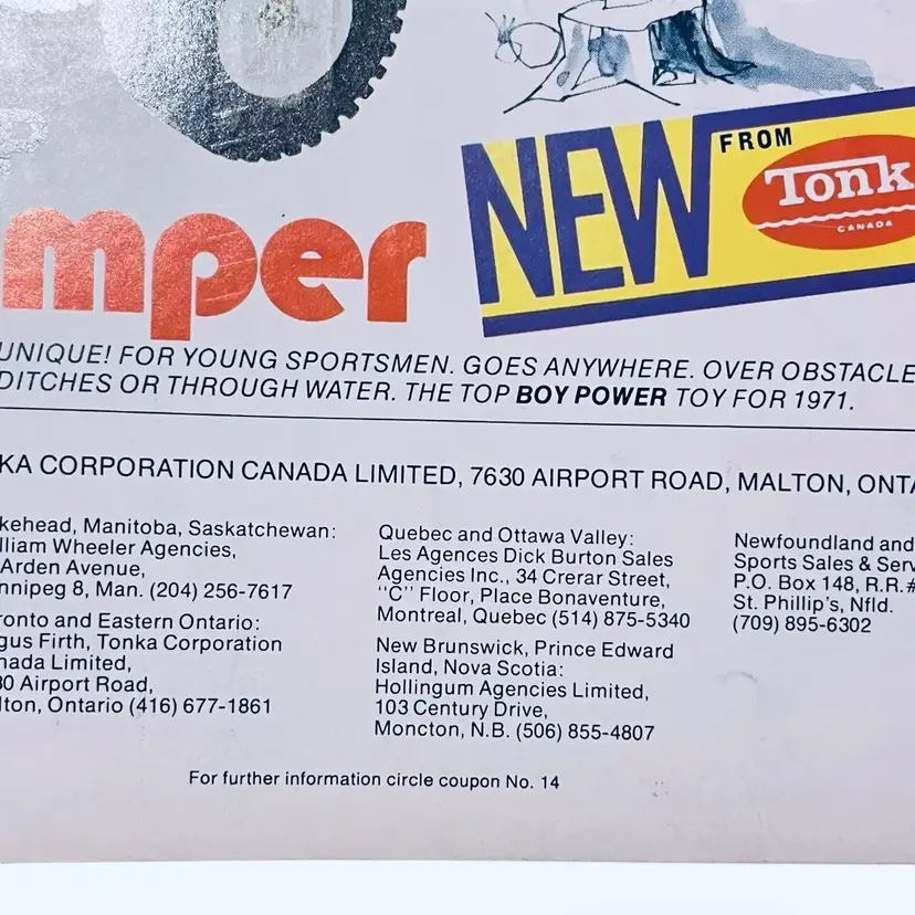 This is vintage trade advertisement flyer (not from a magazine) from 1971. It features a Tonka Stump Jumper toy on one side, and an ad for a Majorette die-cast car store display on the reverse. The flyer is from Canada and showcases the toys in action. Perfect for collectors of vintage advertising and toy memorabilia from the era. The bottom right has a cut corner and a line that looks like a tear but is not. The bottom left has a couple of shallow creases. This is in overall very good, framable condition. The colors are vibrant, and the print is crisp and legible. SEE ALL PICS. Will be shipped flat.