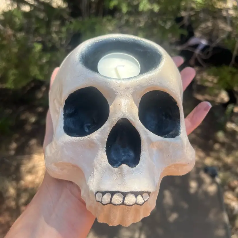 Hand poured, and Hand painted concrete school with hole for candle or air Plant. Featuring Joy’s Healing Jewels tea light candle.