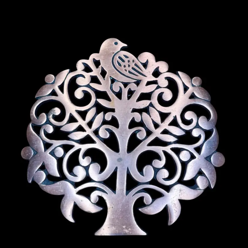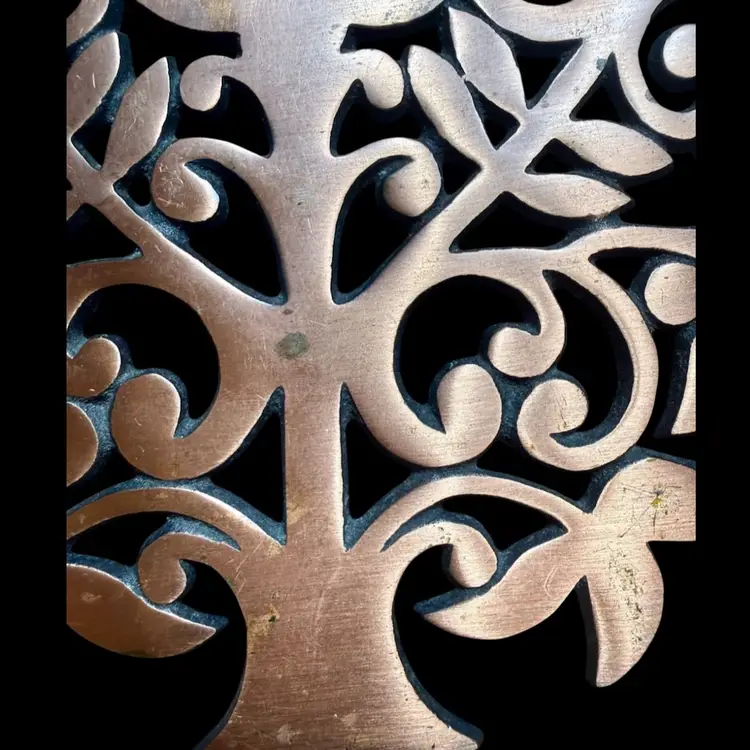 7.5”x7.5”. Vintage cast iron tree of life trivet with a copper finish. There are a few small spots of discoloration - I have not tried cleaning or polishing. Please check photos! Bottom has four feet, three are missing their rubber pads. Has a loop on back for hanging.