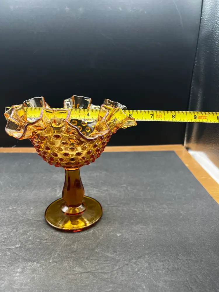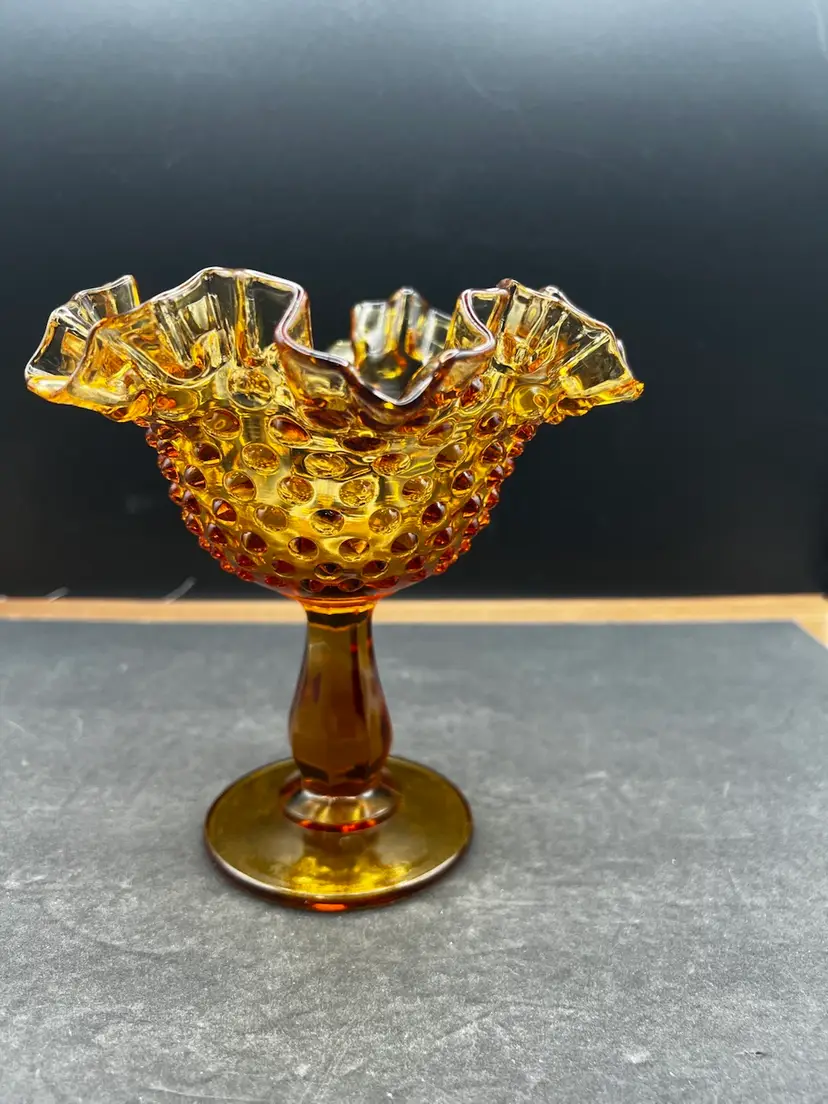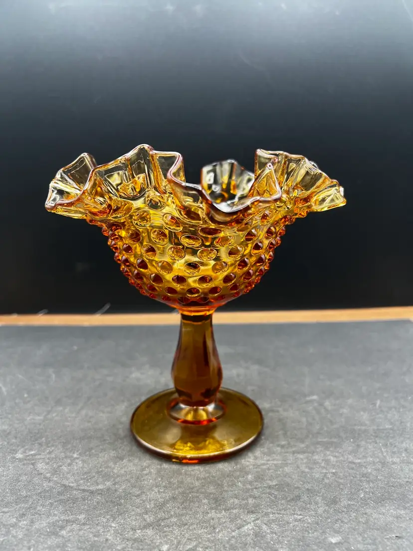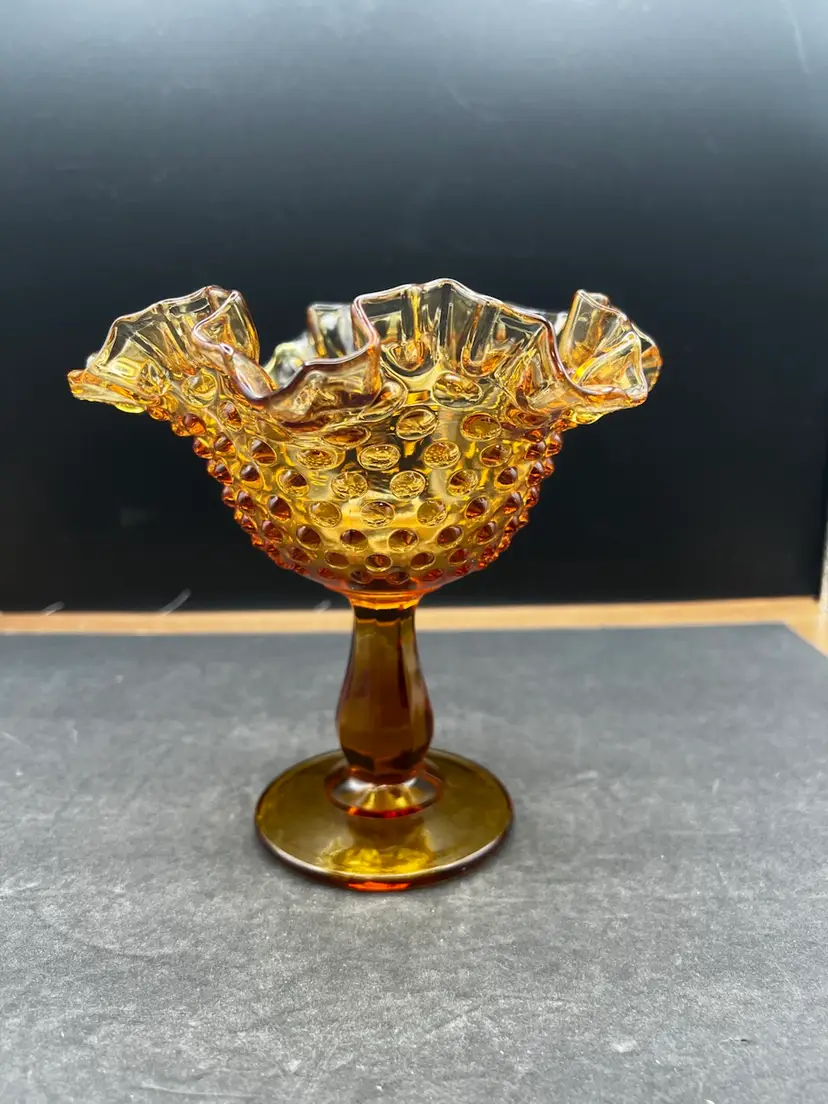 Vintage Fenton Amber Glass Hobnail Ruffled Edge Compote Dish In very good condition, no chips or cracks 6” tall x 6 1/4” wide