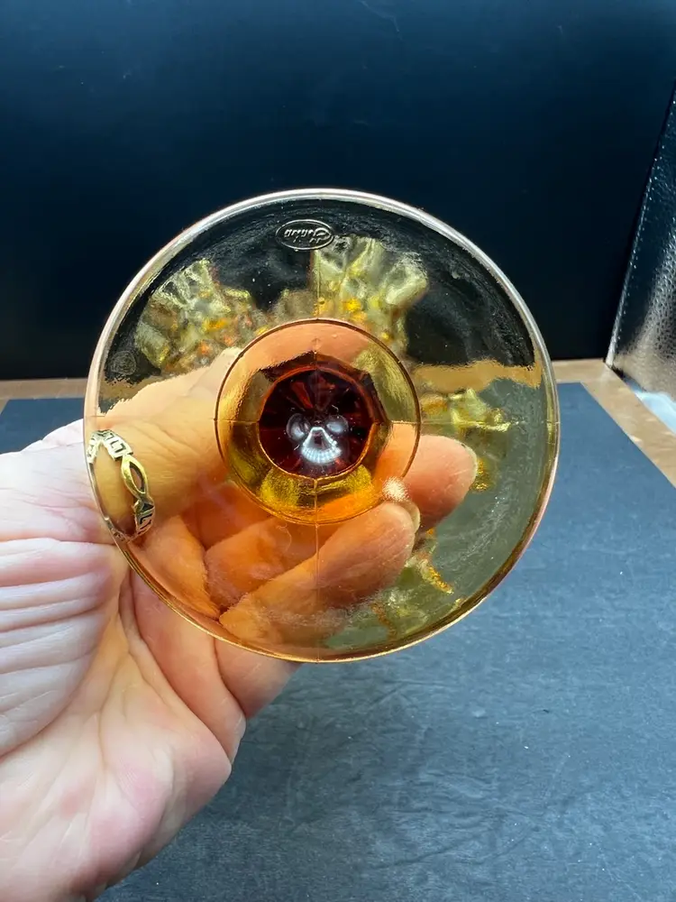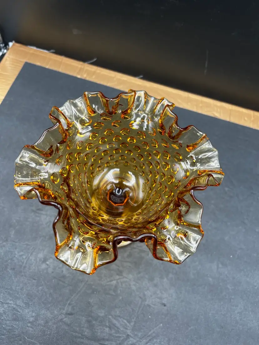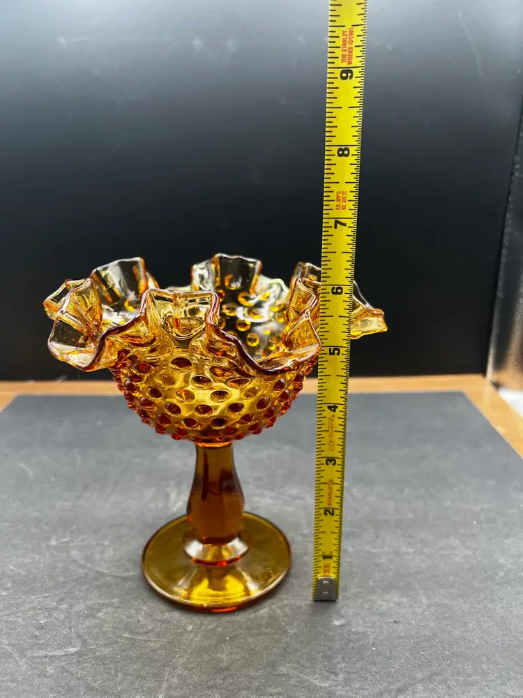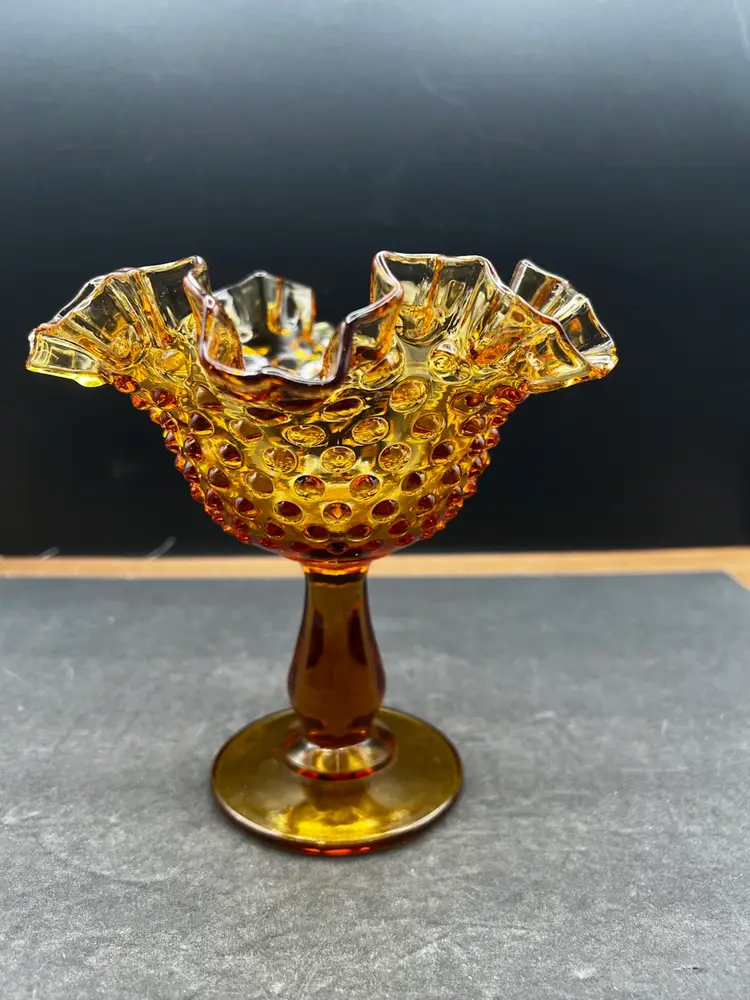 Vintage Fenton Amber Glass Hobnail Ruffled Edge Compote Dish In very good condition, no chips or cracks 6” tall x 6 1/4” wide