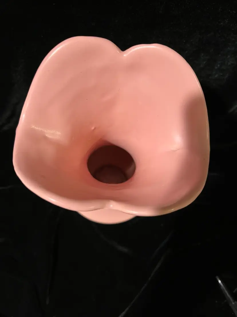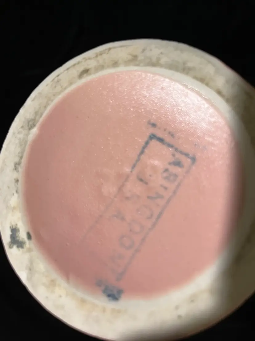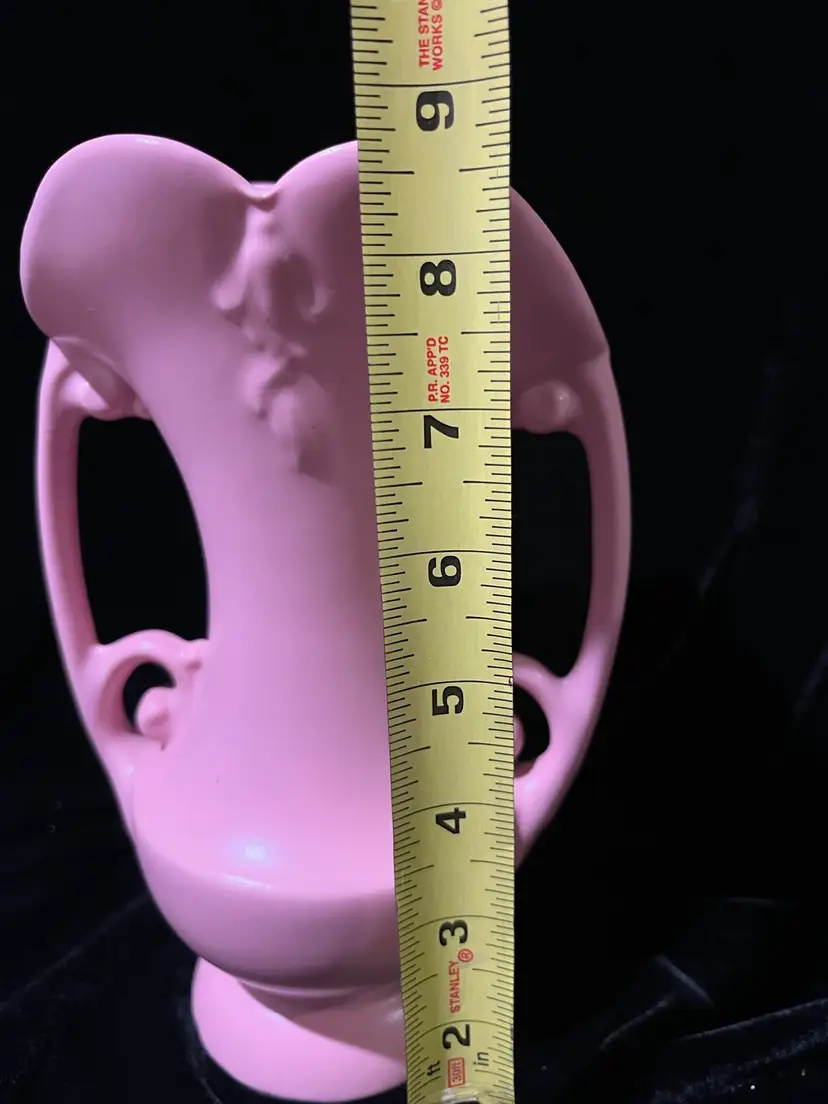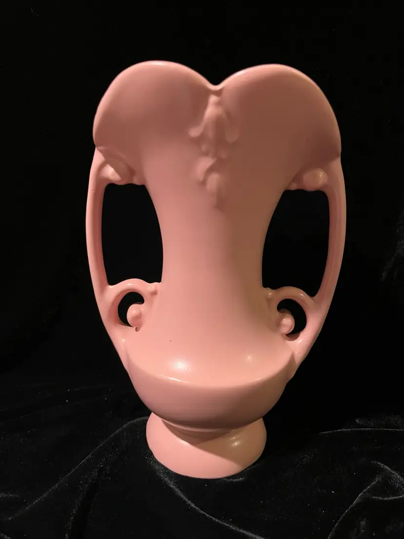VINTAGE Abingdon pottery vase Pink #522 USA double handles scroll. Art pottery made by Abingdon Pottery in Knoxville, IL. Lovely pastel pink color, floral details, scrolled handles. Approx. 9 inches tall, 6 inches wide at widest part. Made between 1934 and 1950.