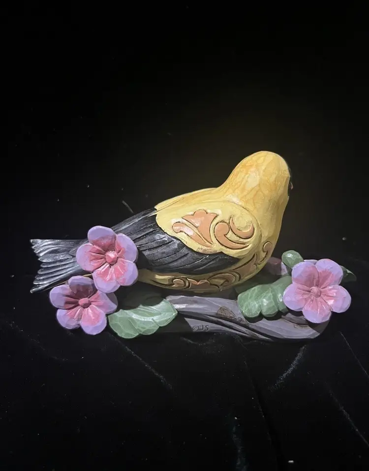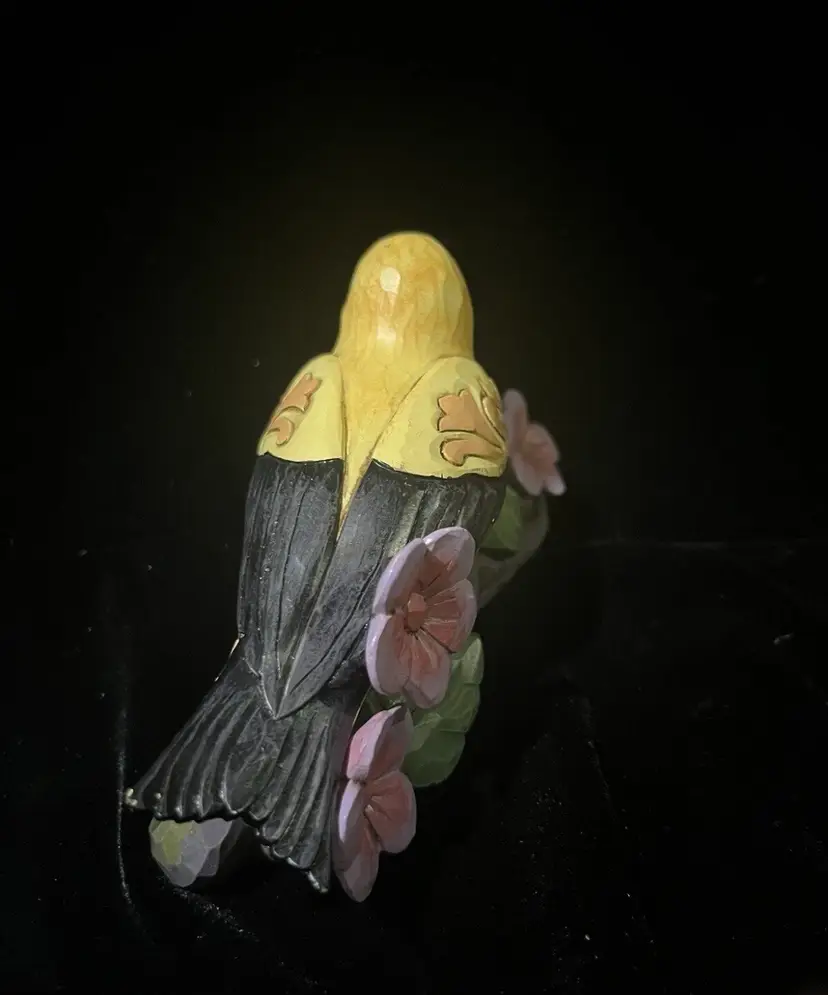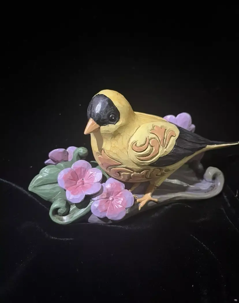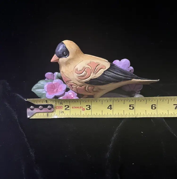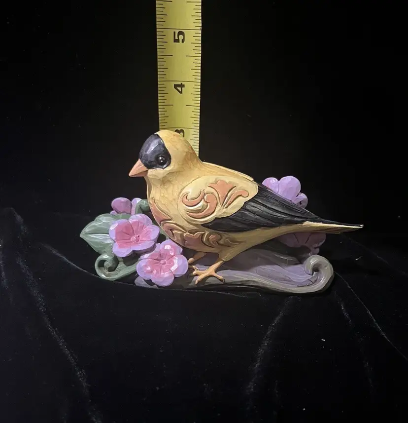 This beautiful figurine by Jim Shore features a stunning Goldfinch in a moment of grace and harmony. The intricate details and vibrant colors make it a wonderful addition to any collection or decor. Crafted with expert skill, this piece captures the essence of nature's beauty in a unique and charming way. Perfect for bird lovers and admirers of fine art alike, this Golden Harmony Goldfinch figurine is sure to be a delightful addition to any home. This beautiful figure is in excellent condition with no chips or cracks. Perfect for your collection or for gifting! Please review pictures carefully for size, condition and beautiful craftsmanship.