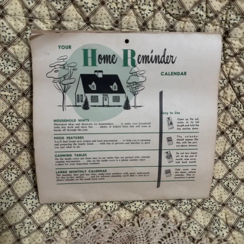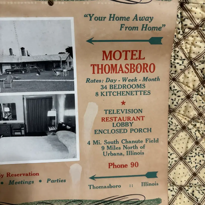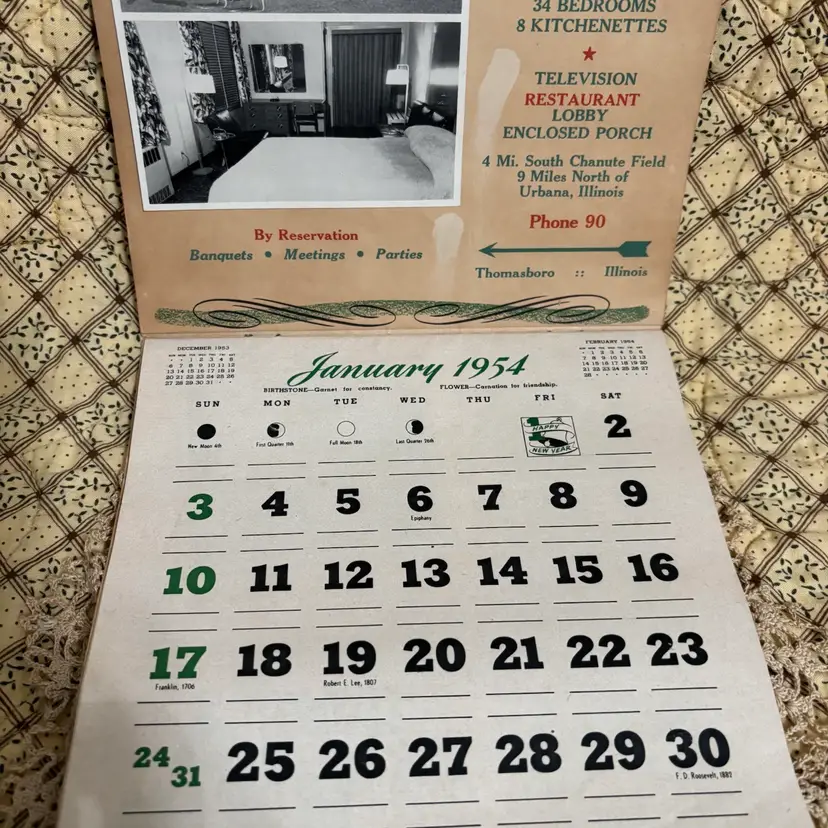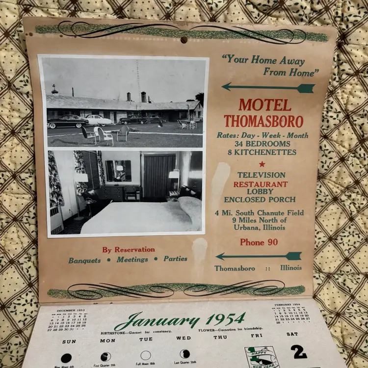 1954 Motel Thomasboro in Urbana ILL advertising calendar complete with actual photo of this 1 star motel. All sorts of hints for the homemaker. No tips or tears. Age discoloration but a really fun piece of ephemera. Closed- 7”X 7.5”.