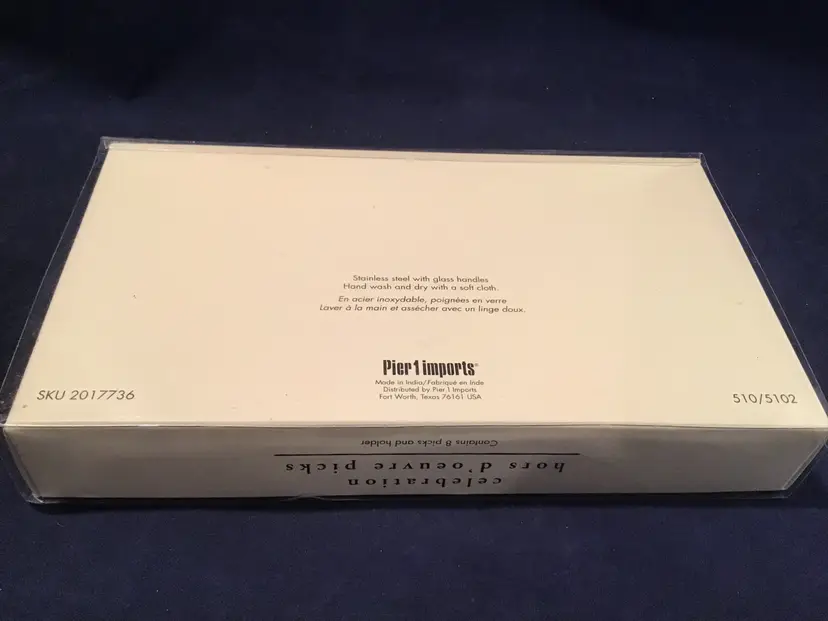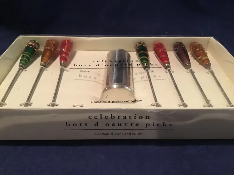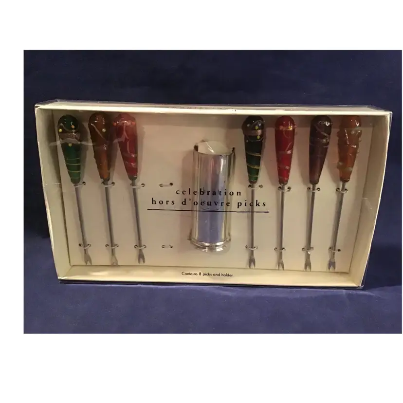 Stainless steel shaft on blown glass handles. Hand wash & dry with a soft cloth. SKU 2017736, 510/5102. Pre-Owned/used 4.25" tall. 1 purple Missing. remaining pieces are in good condition.