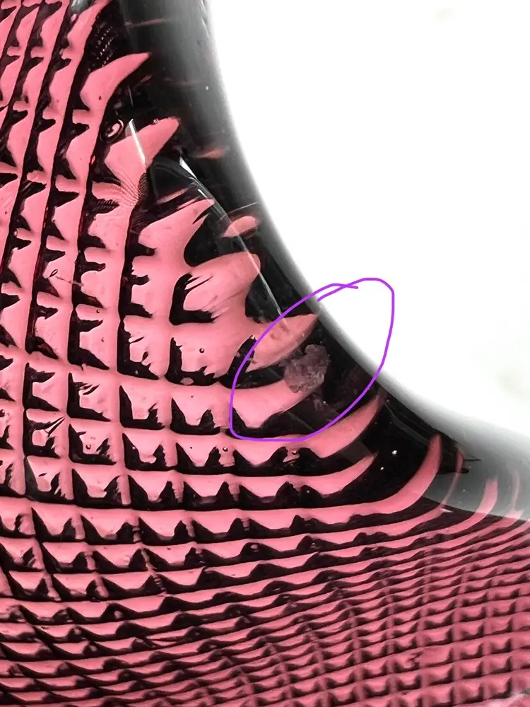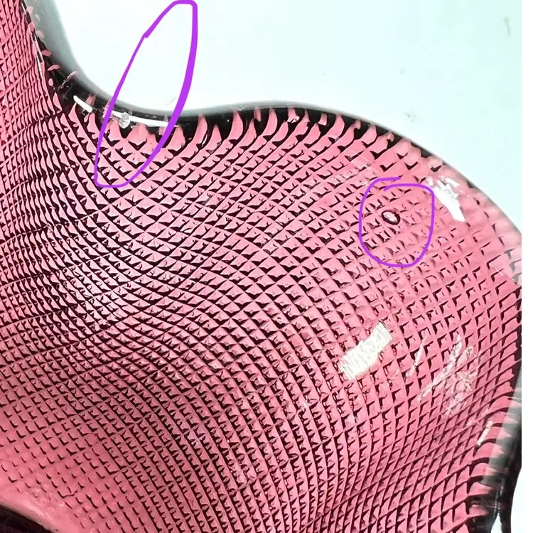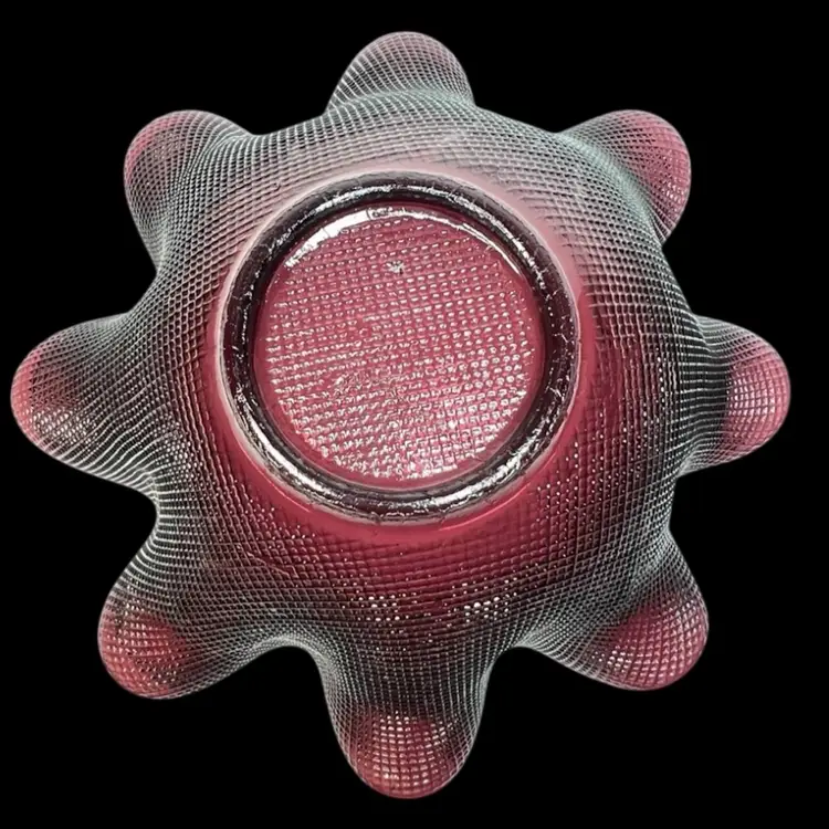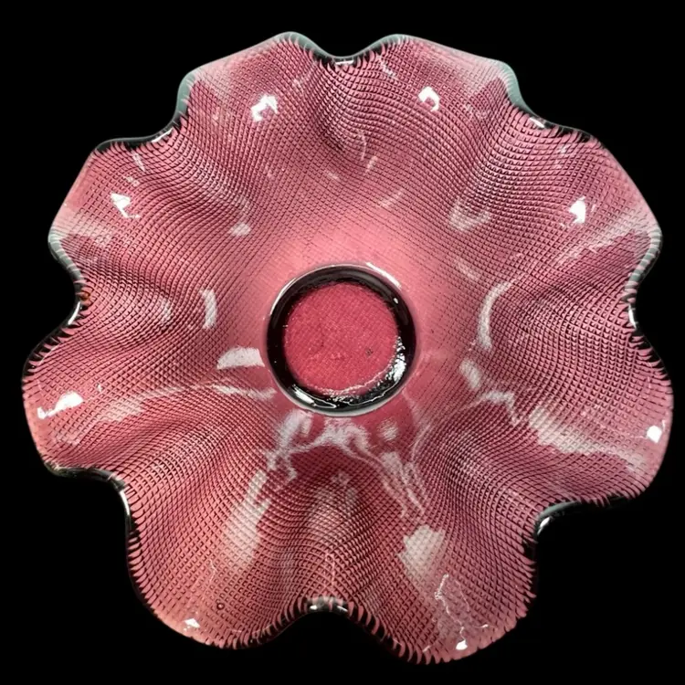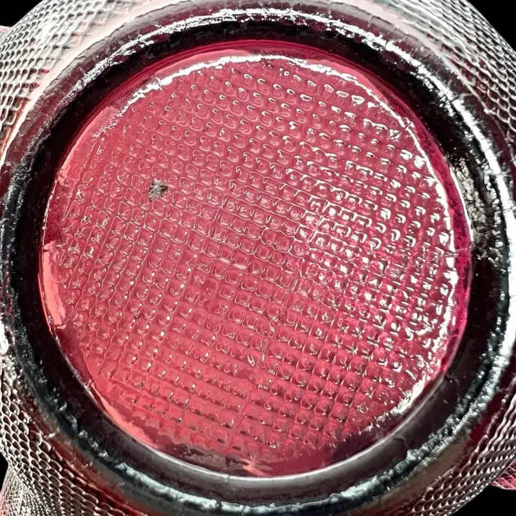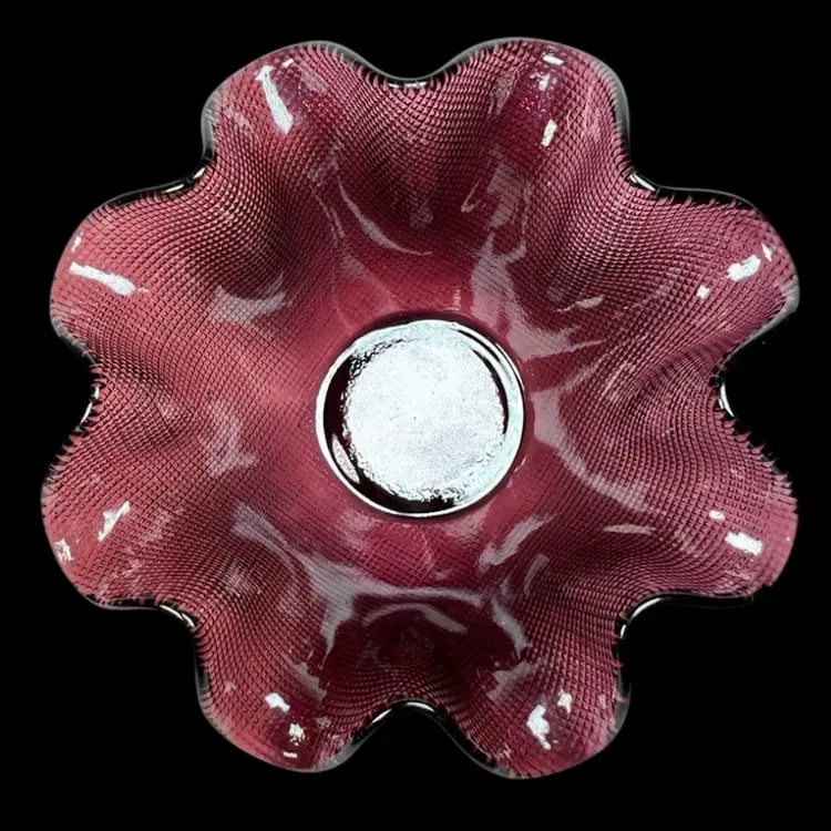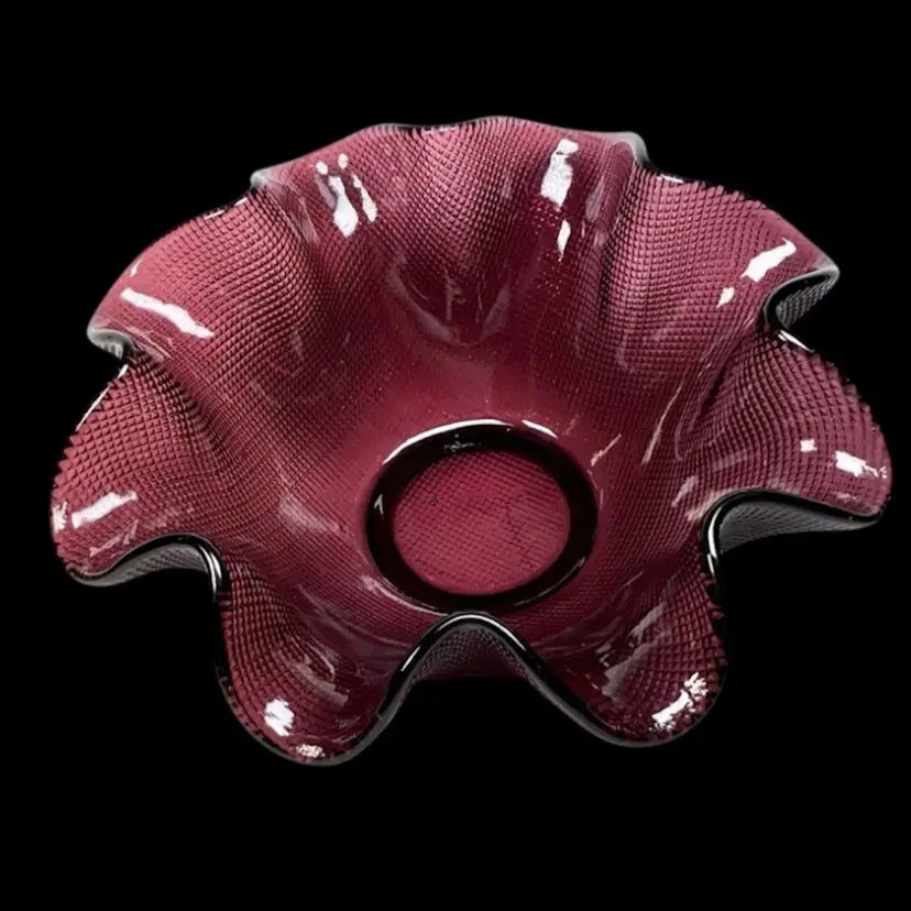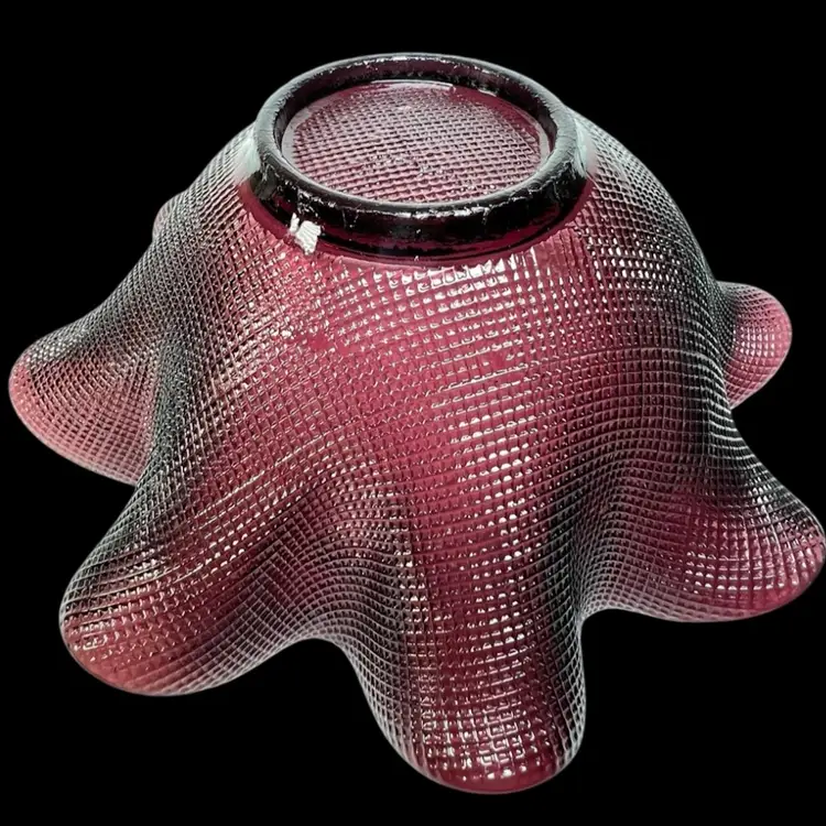 Amethyst Purple incredible color Colony Ruffled serving bowl Great waffle weave textured pattern on exterior Weighs 1 pound 8 ounces 8-3/4” Diameter x 3-1/2” Tall Condition: 1 very small shallow scratch-chip on inner rim. Please see last 2 photos. A couple manufacturers bubbles in the glass (bottom & side), as shown in last few photos.