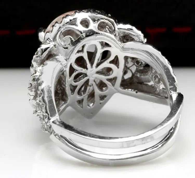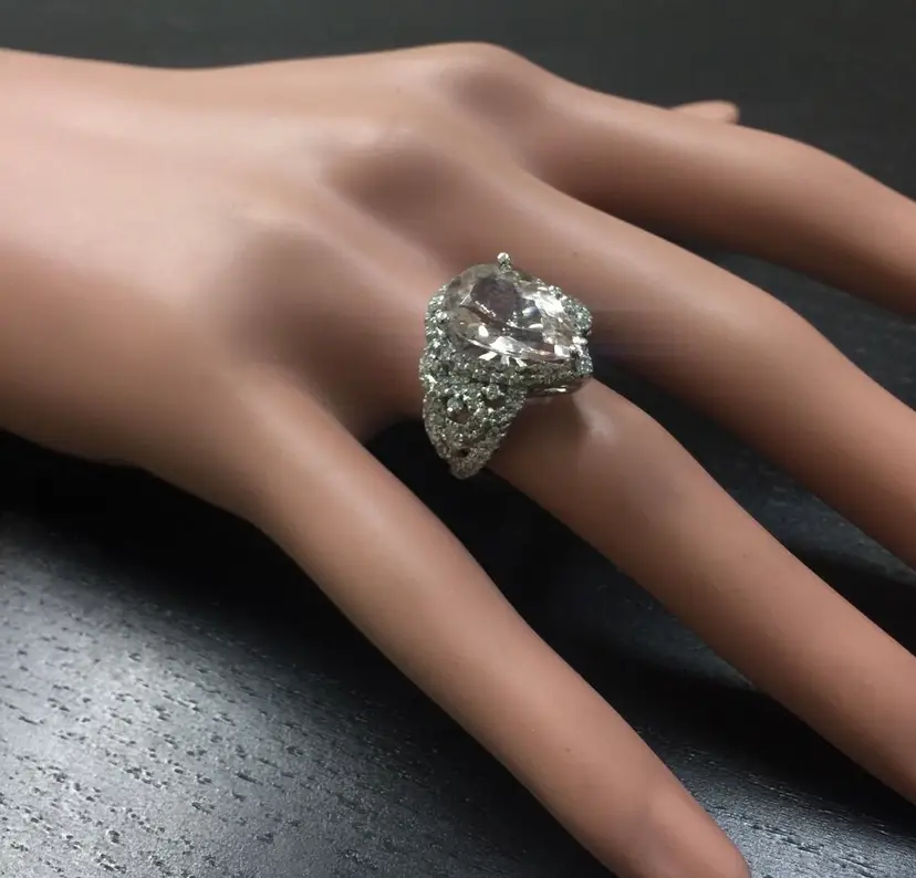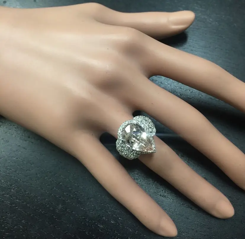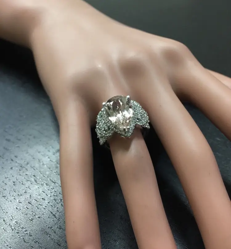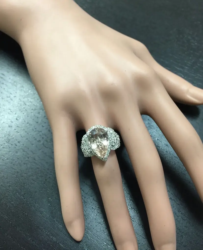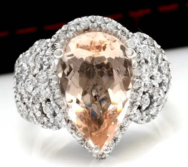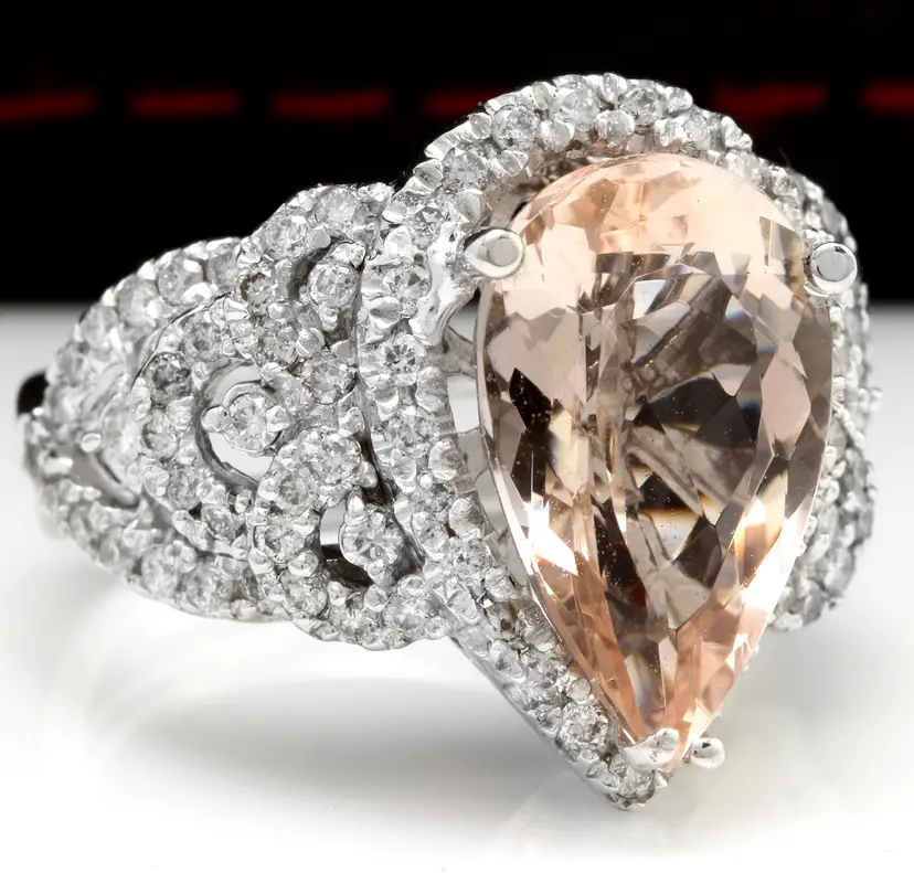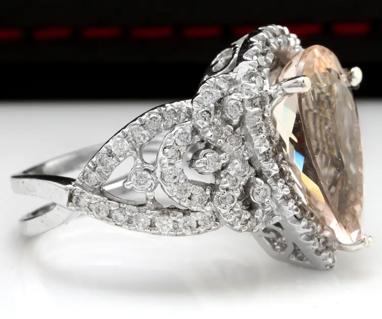 Main Stone Color: Peach Main Stone Treatment: Heating Metal Purity: 14k solid gold Main Stone: Morganite Sizable: Yes Main Stone Creation: Natural Metal: White Gold Ring Size: 6 Total Carat Weight (TCW): 6.93 Main Stone Shape: Pear Brand: Unbranded Type: Ring