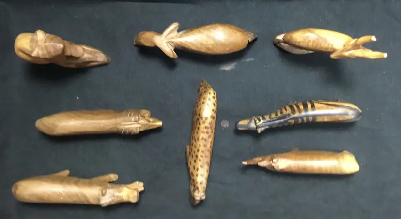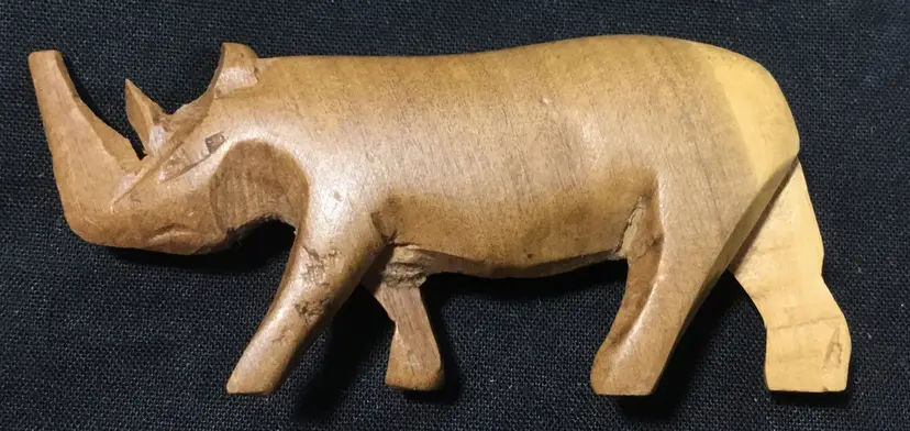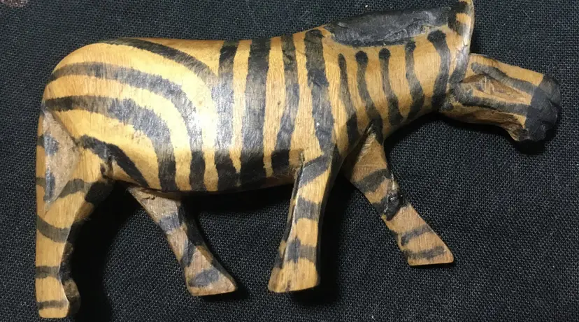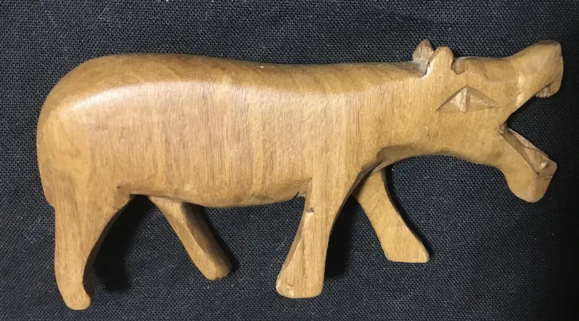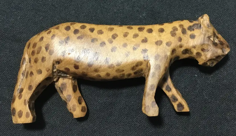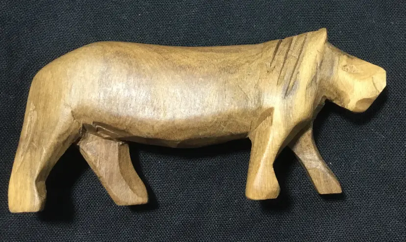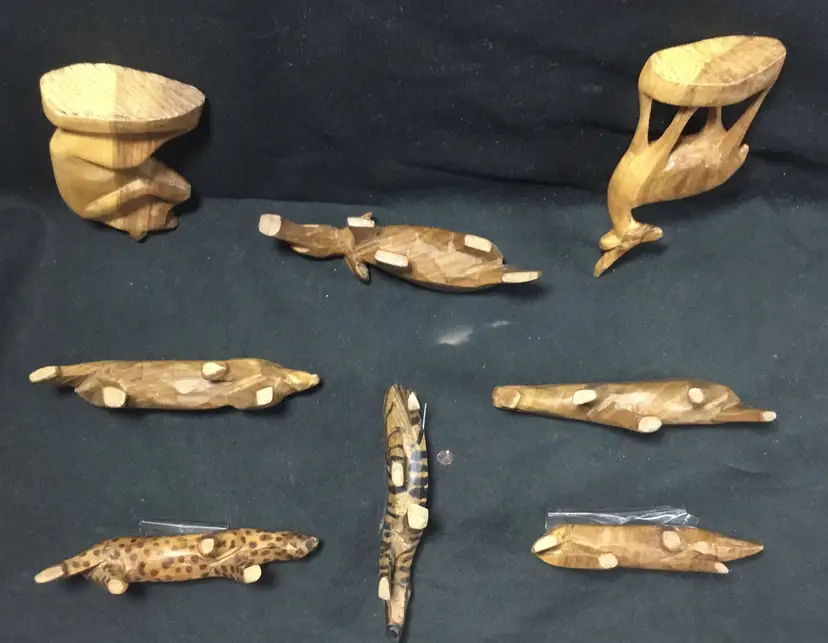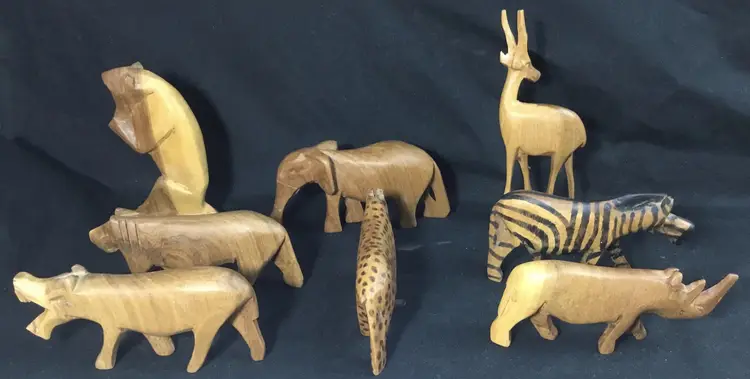 Lot of 8 small, hand carved African animals: lion, bear, zebra, gazelle, cheetah, rhino, hippo, elephant. Smoothed, matte finish. Some rough places on wood, (See photos) Wood unknown but some figures have darker and lighter wood. Zebra has painted stripes, cheetah has painted spots. Others are plain wood. Good to very good condition, zebra had front leg broken and repaired, bear figure seems abstract, unfinished (See all photos)