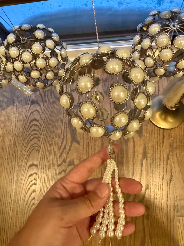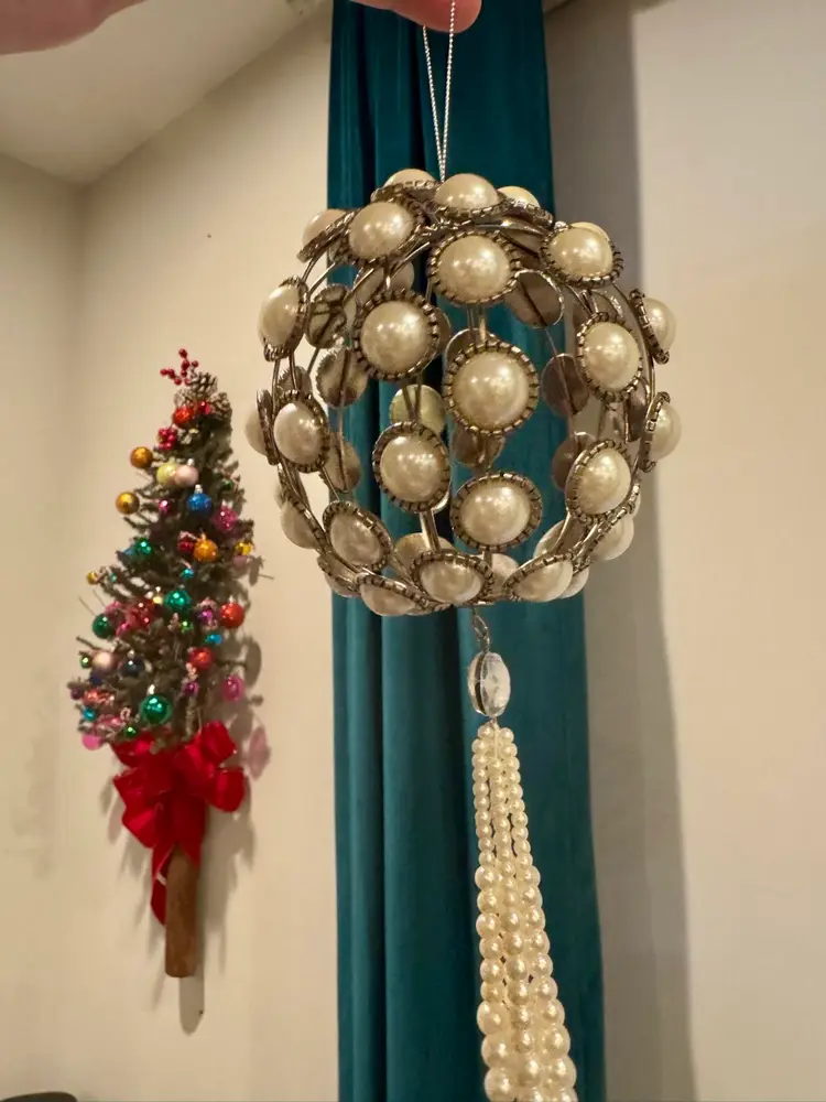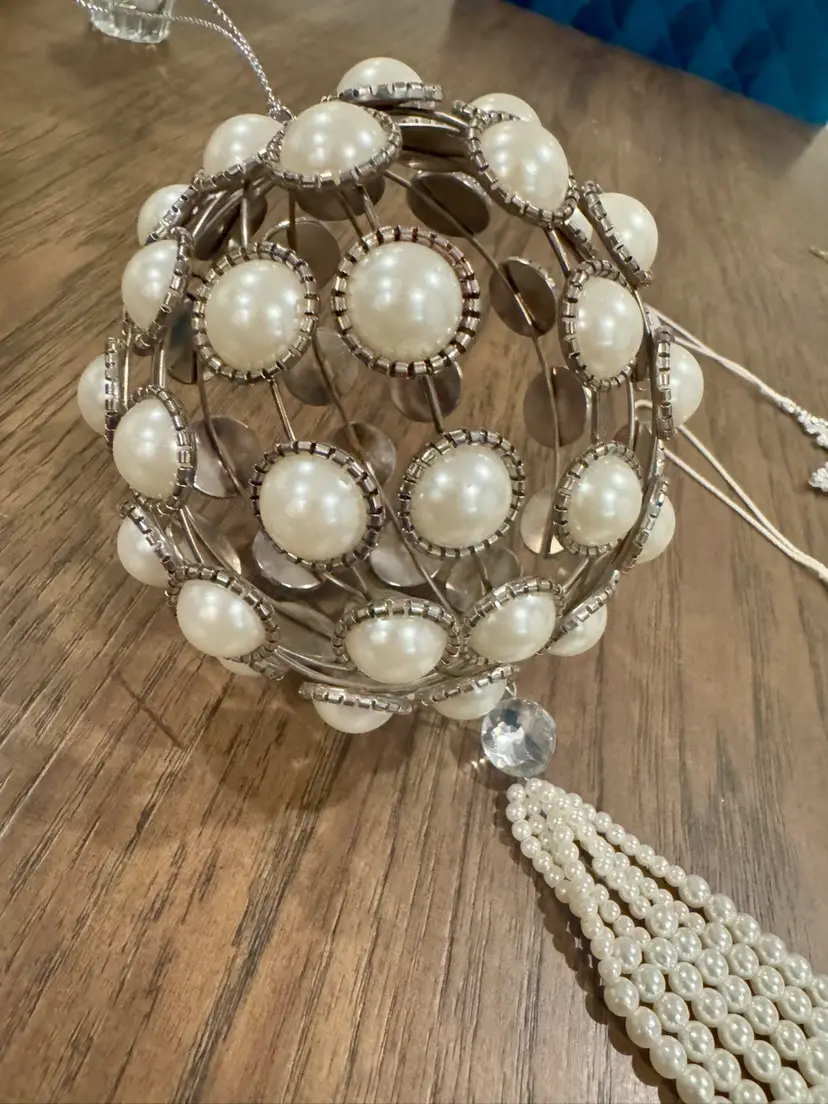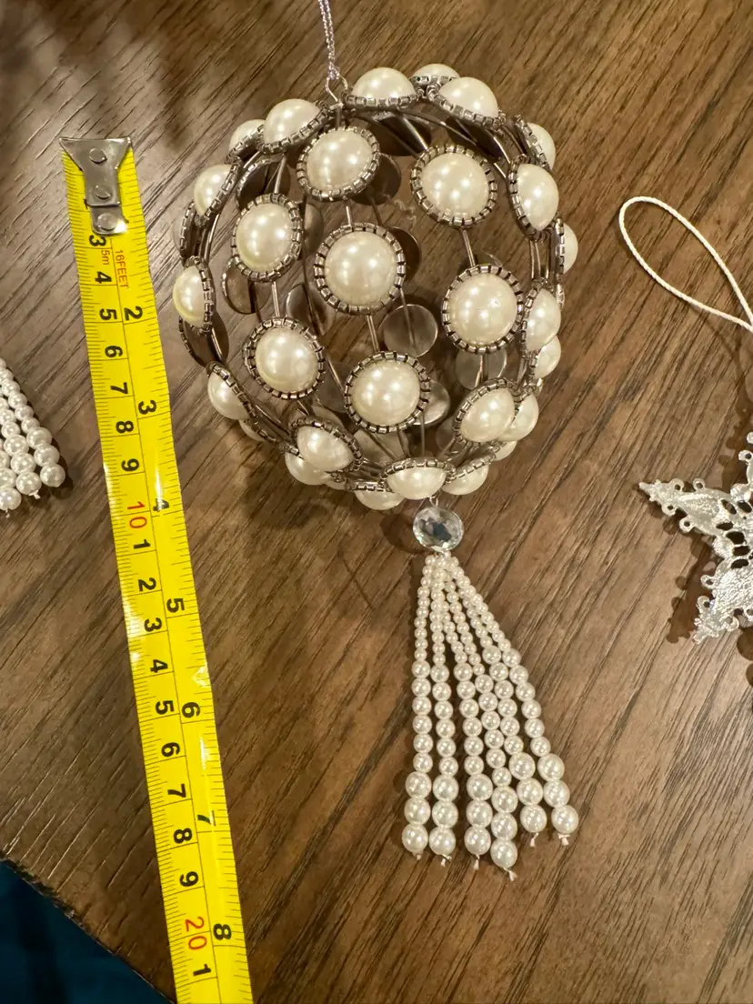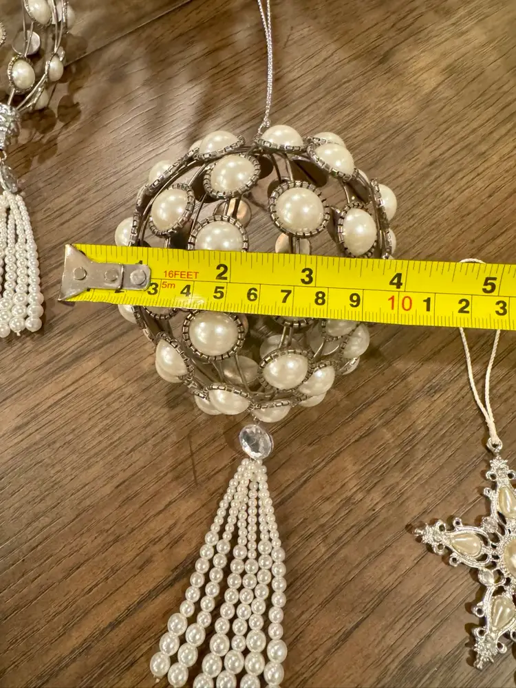 Set of 5 big and beautiful show stopper ornaments. One ornament has 3 pearls missing and another ornament has one pearl missing, other than that no tarnishing and in beautiful condition. I’ve personally have owned these for 20 years.