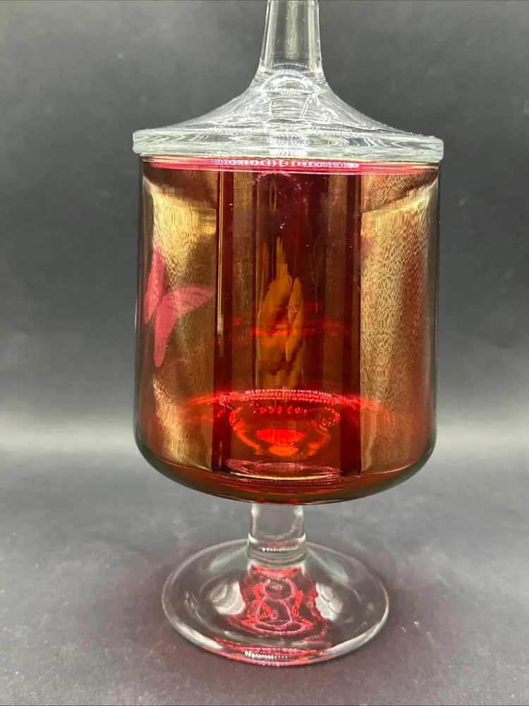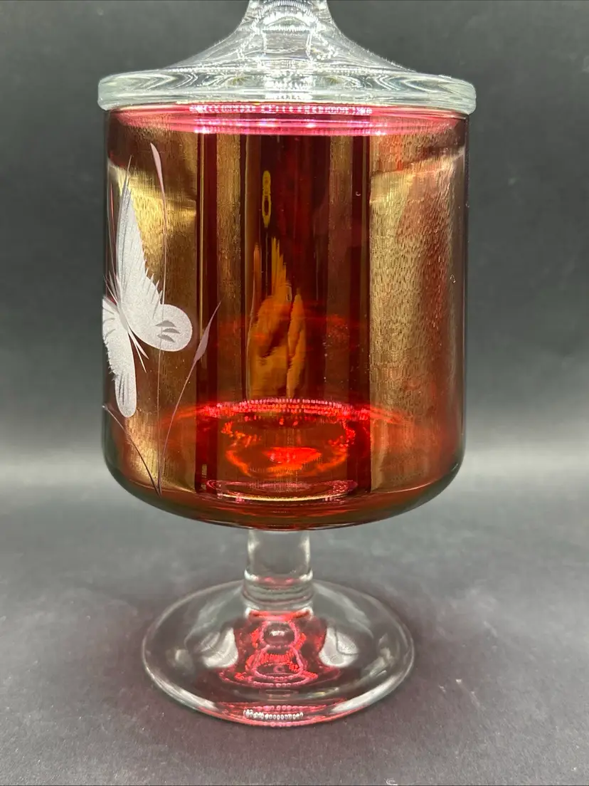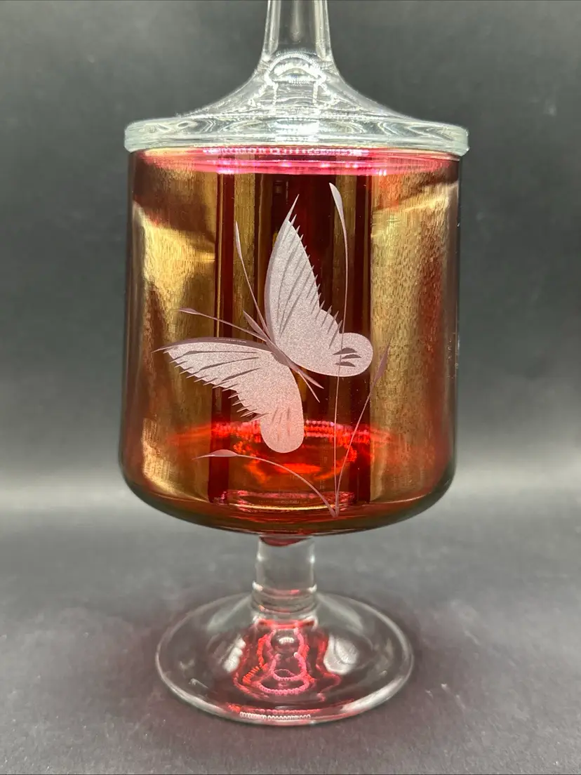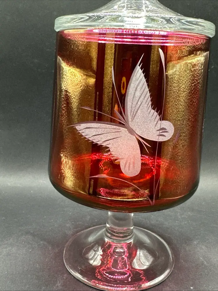 This vintage vase is a rare find, with a beautiful ruby red color and intricate etched patterns of a butterfly. The vase stands at 8 inches tall and features a cut to clear design, showcasing its high-quality craftsmanship. It is an original piece from WJ Hughes, a well-known brand in Canada, and is a great addition to any mid-century modern collection. The vase is also perfect for use as an apothecary jar or to display your favorite flowers.