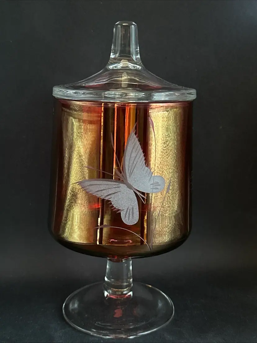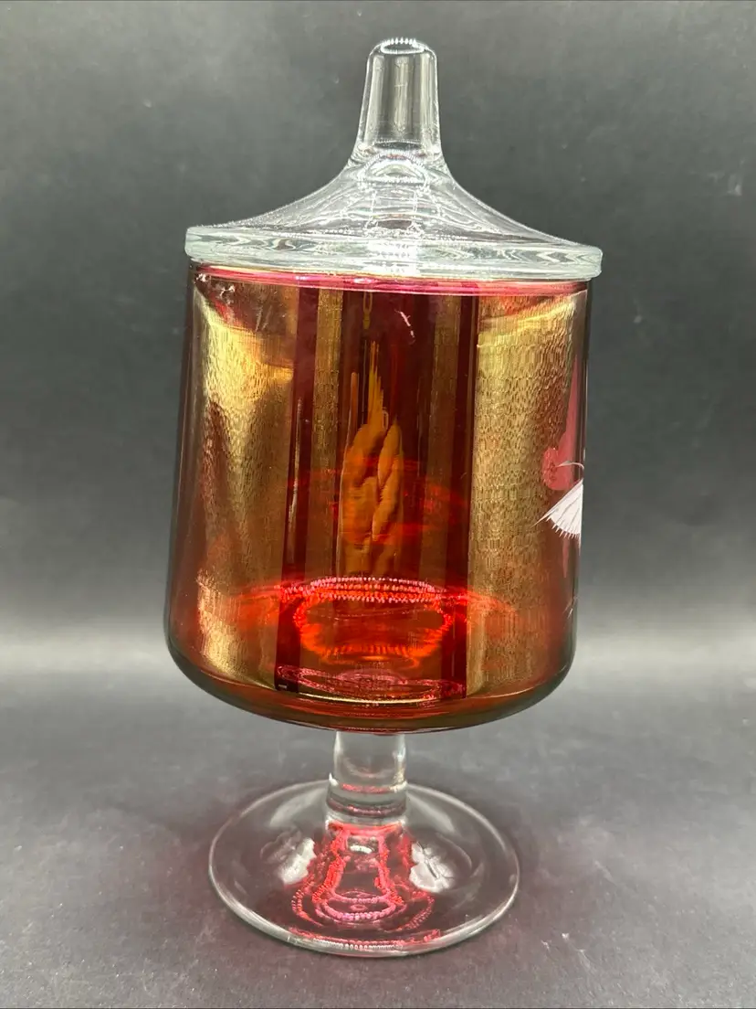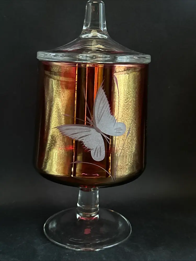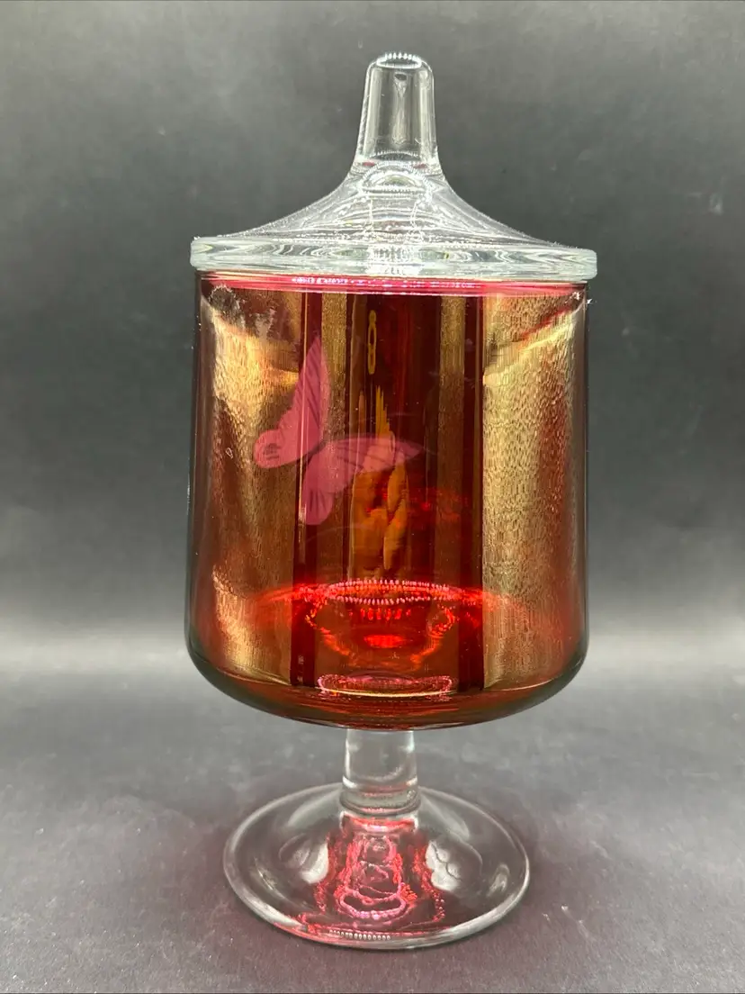 This vintage vase is a rare find, with a beautiful ruby red color and intricate etched patterns of a butterfly. The vase stands at 8 inches tall and features a cut to clear design, showcasing its high-quality craftsmanship. It is an original piece from WJ Hughes, a well-known brand in Canada, and is a great addition to any mid-century modern collection. The vase is also perfect for use as an apothecary jar or to display your favorite flowers.