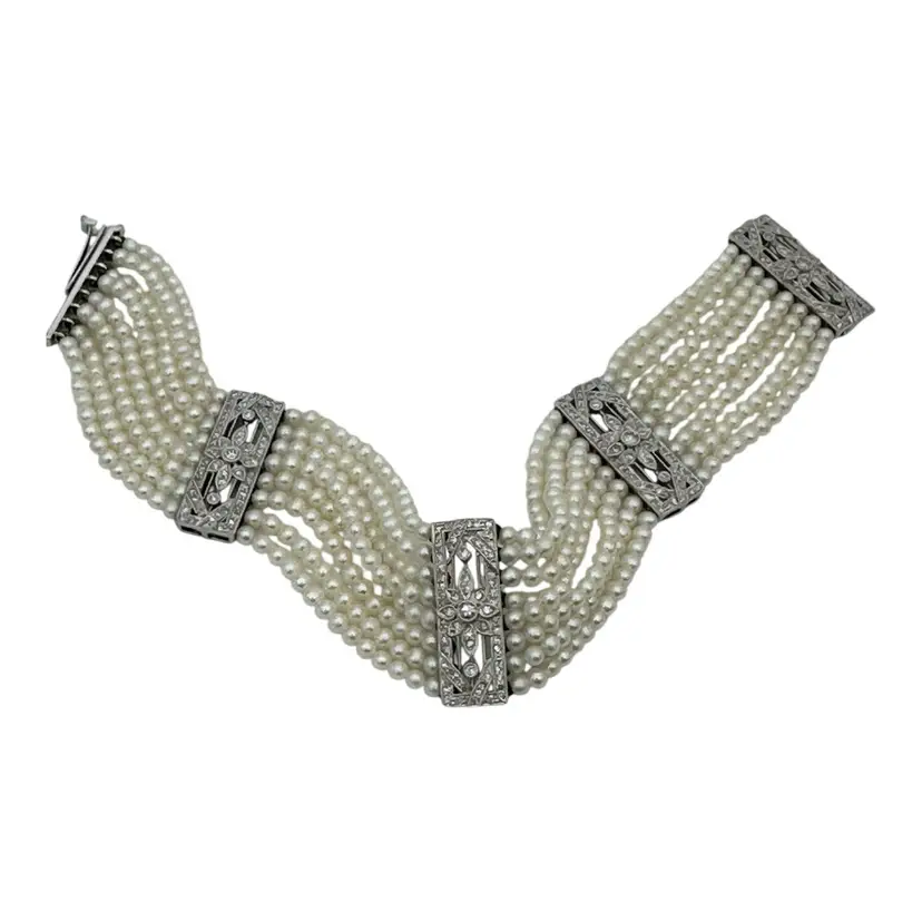 8 Strand Pearl and Diamond Bracelet This spectacular platinum and diamond pearl bracelet is made with the finest AAA pearls and diamonds Eight strands of perfectly matched pearls measure 2.5 mm each and are attached by four Ornate diamond Separators The diamond separators measure nearly 1 inch in length by .33 inches wide The total length of this beautiful bracelet is 7 inches There is a secure slide clasp mechanism The estimated total diamond weight is .50-.60 carat Quality of the diamonds are VS and FG color GIA Gemologist inspected and evaluated