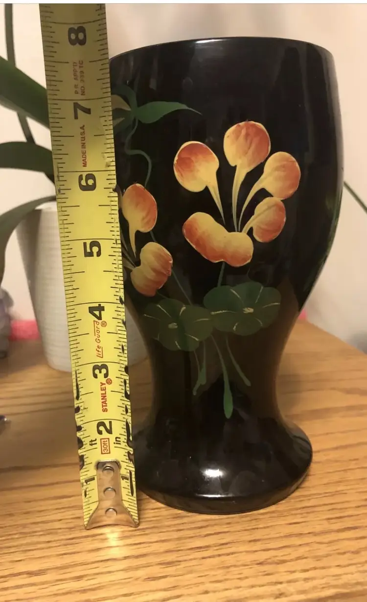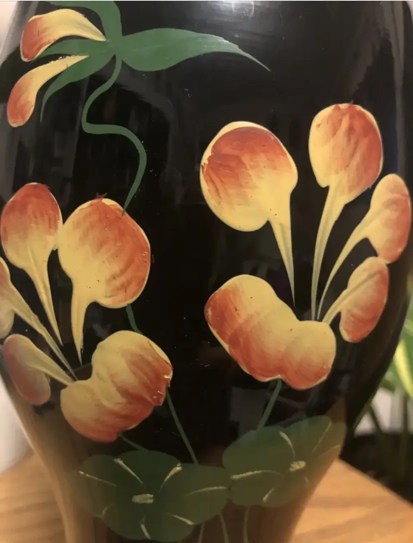 Add a touch of elegance to your home decor with this vintage black glass vase. This measures 8 inches height has beautiful handpainted nasturtium flowers on it