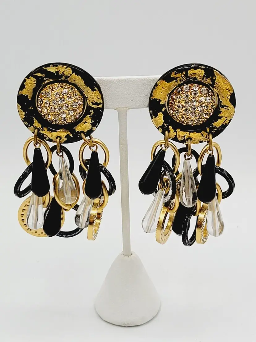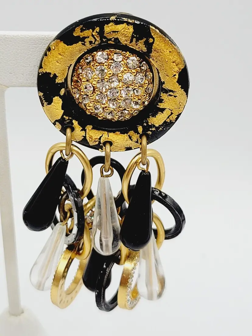 Size: approx 3'' long Condition: Very good vintage Era: Circa 1980's Signed: Unmarked Details: Fabulous round gold plated earrings accented rhinestone in center, dangled with black and clear drops, gold and black hoops. Amazing designer quality earrings. Made from glass, rhinestone, acrylic, resin, and metals. This piece is heavy and well made.
