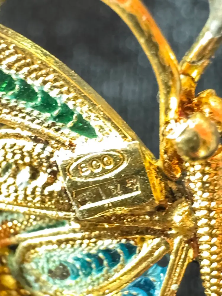 This sweet little butterfly pin was crafted from 800 silver in the Mid 20th Century. It has a beautiful filigree finish with blue, green and golden colored enamel. It measures 1” by 3/4 “. Free shipping to you.