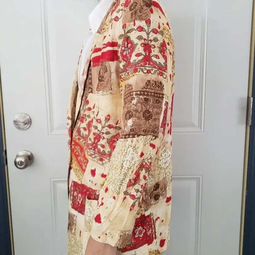 I believe it to be polyester but it is light and unlined so very wearable for warmer climates.