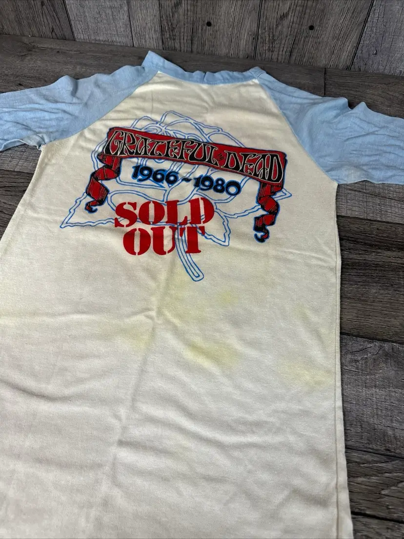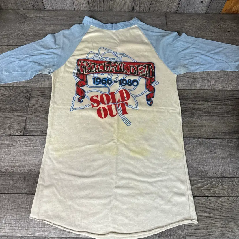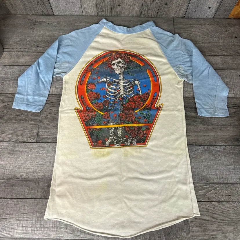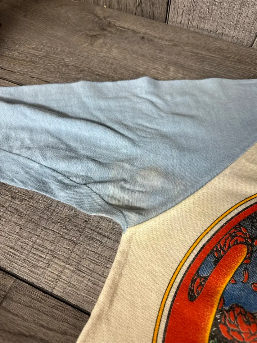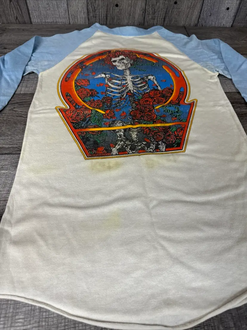 This vintage t-shirt from the 80s is a rare gem for any Grateful Dead fan. Featuring a unique graphic design anyone would enjoy! -What you see is what you receive, please see photos. -Item is SOLD AS IS. -Pit to pit 18” -From top to bottom 30” -Does have some discolored areas on front and back. See pictures! -Free shipping.