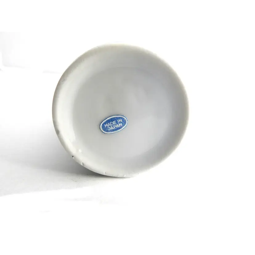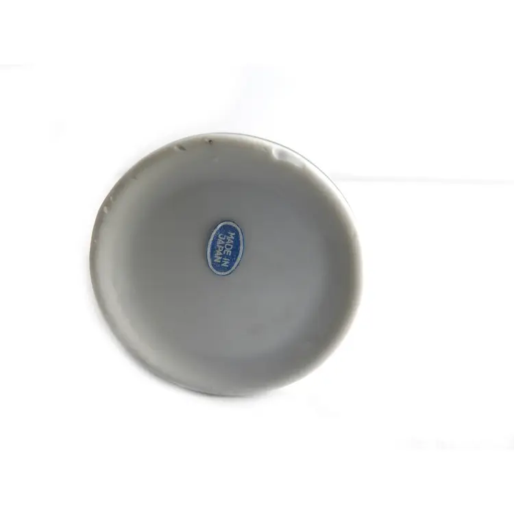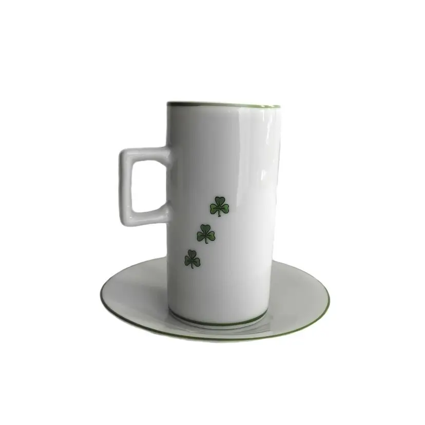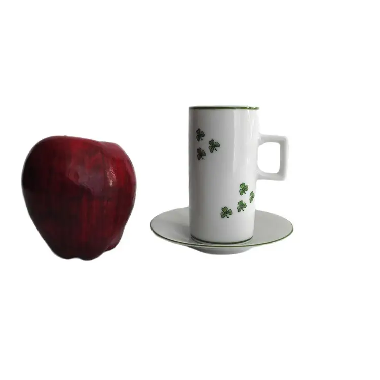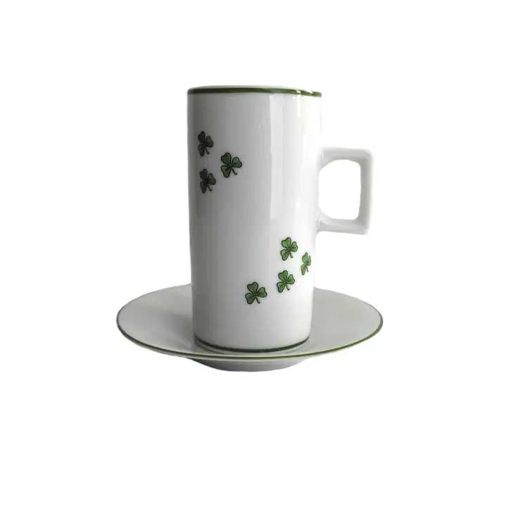 Vintage clover design narrow coffee mug/cup with saucer. Made in Japan in 1980s. 4" tall, 3" wide, 2" in diameter at the top, 2" in diameter at the base. Saucer is 4 3/8" in diameter. Good vintage condition. No cracks, no crazing. There are a few flee bite chips on the mug bottom.