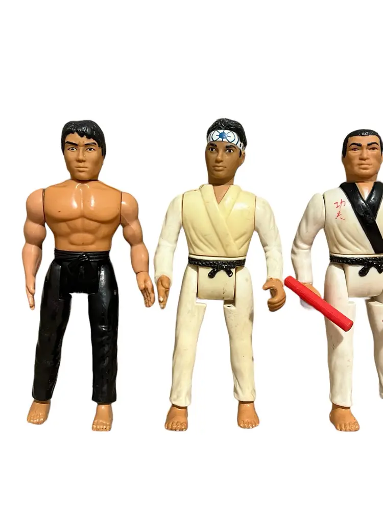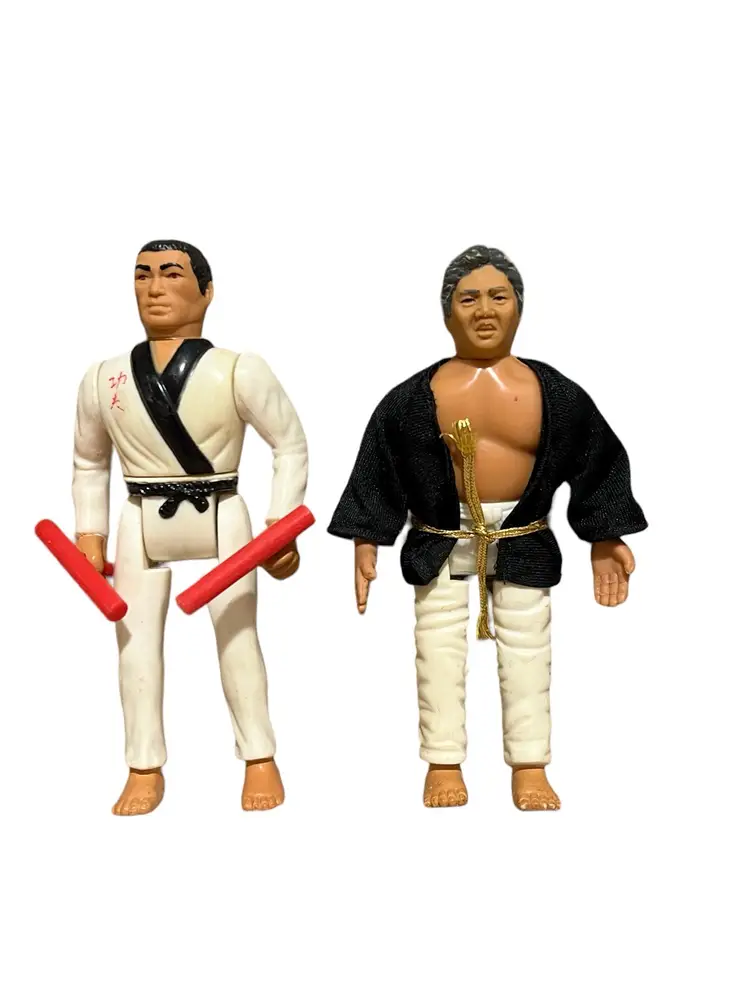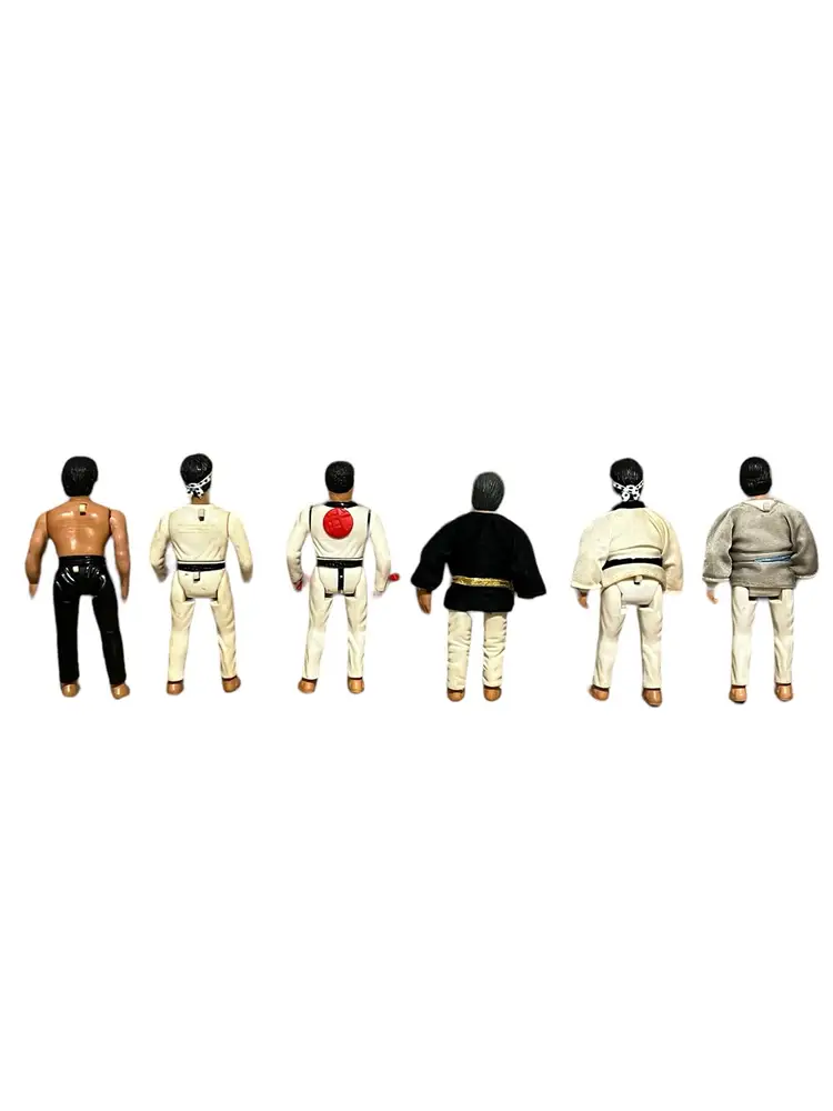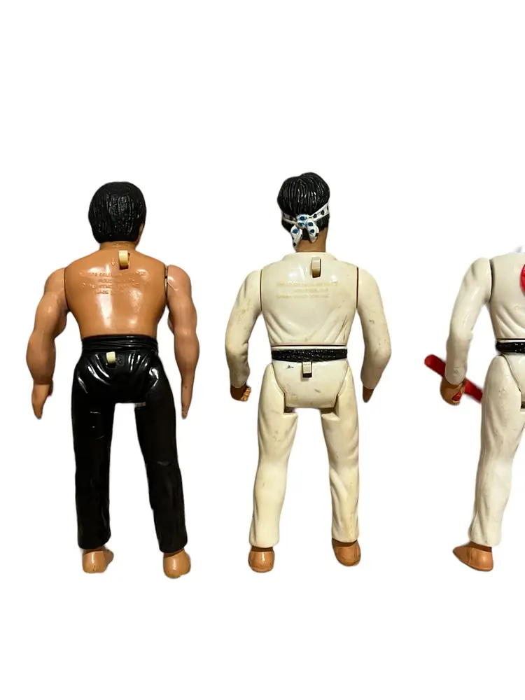 Mixed lot of Karate Kid, Bruce Lee, and Secret of the Ninja from Remco Toys. Some have working actions, but most do not. They have stains, markings, and yellowing.