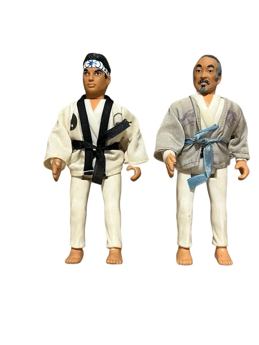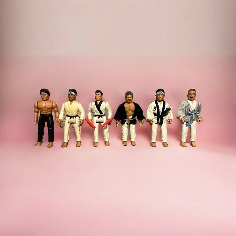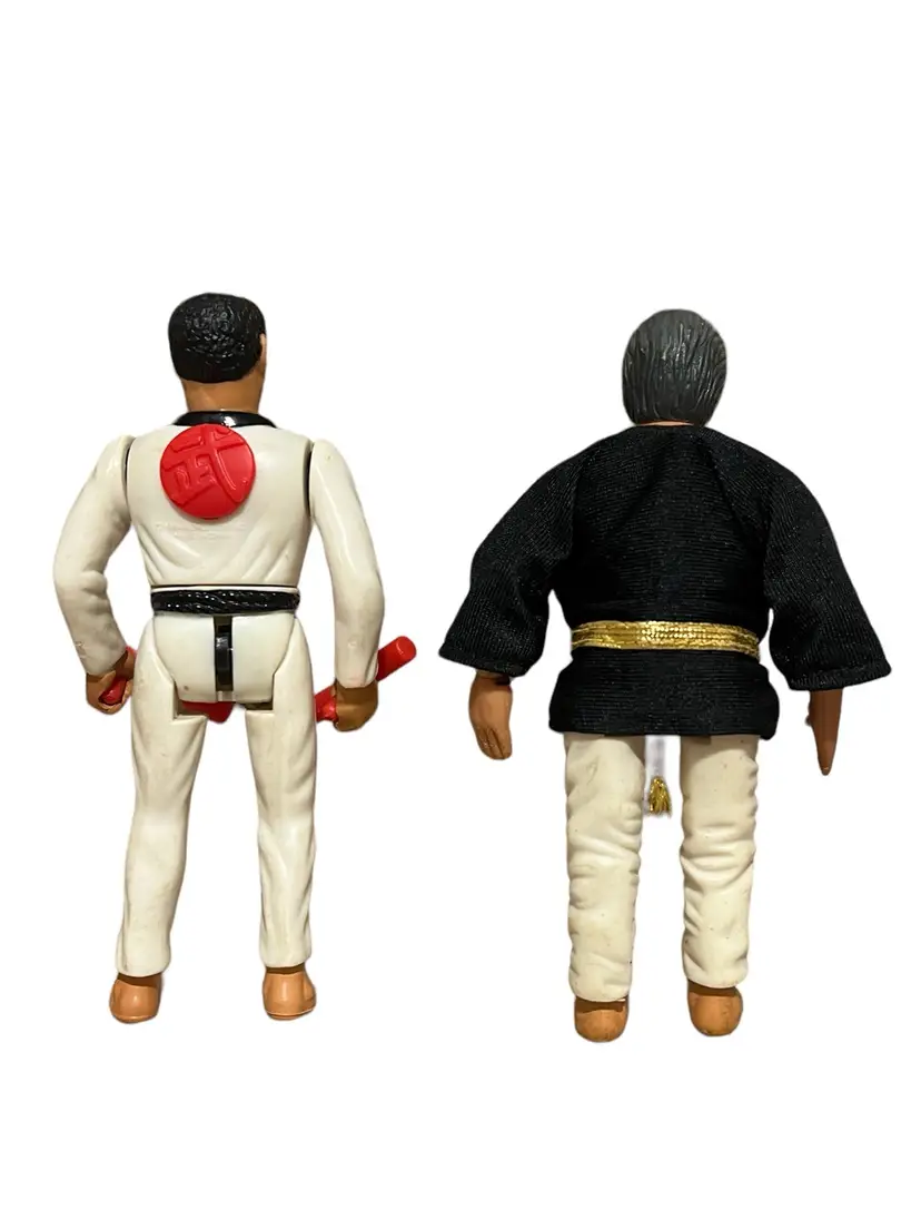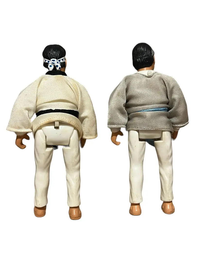 Mixed lot of Karate Kid, Bruce Lee, and Secret of the Ninja from Remco Toys. Some have working actions, but most do not. They have stains, markings, and yellowing.