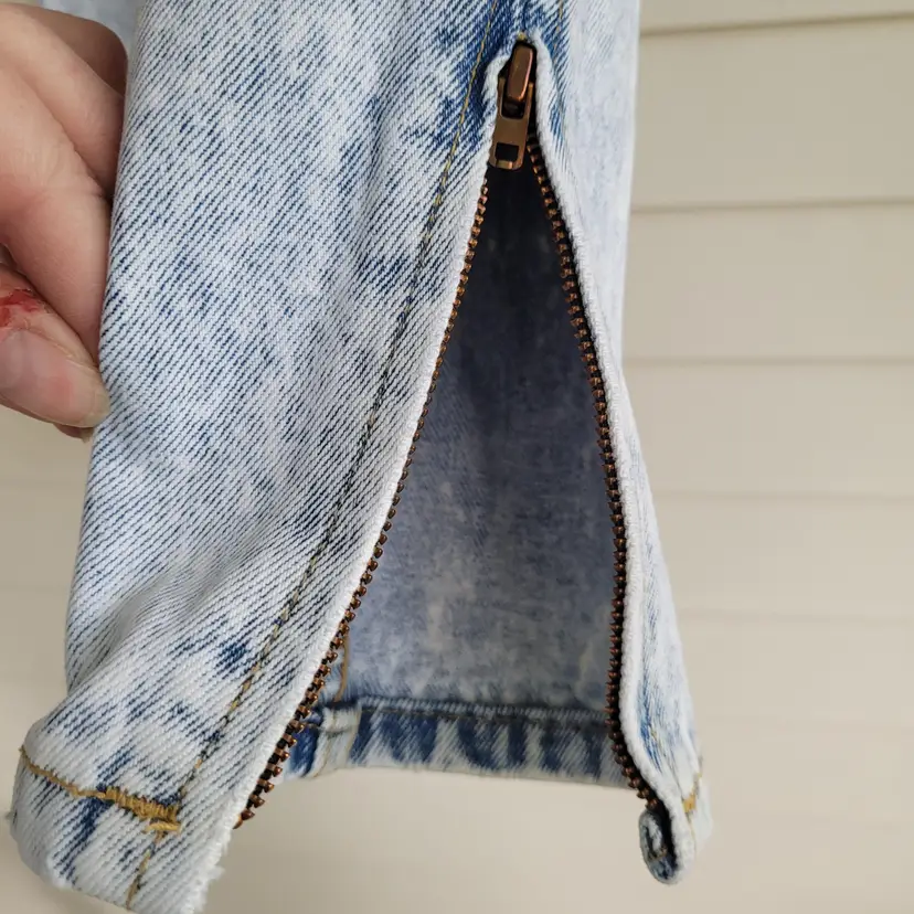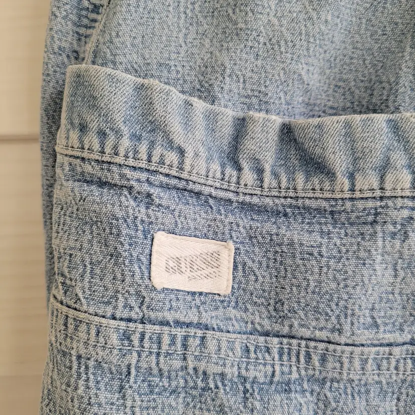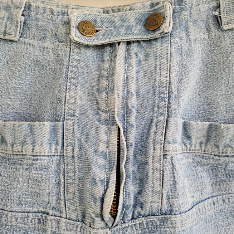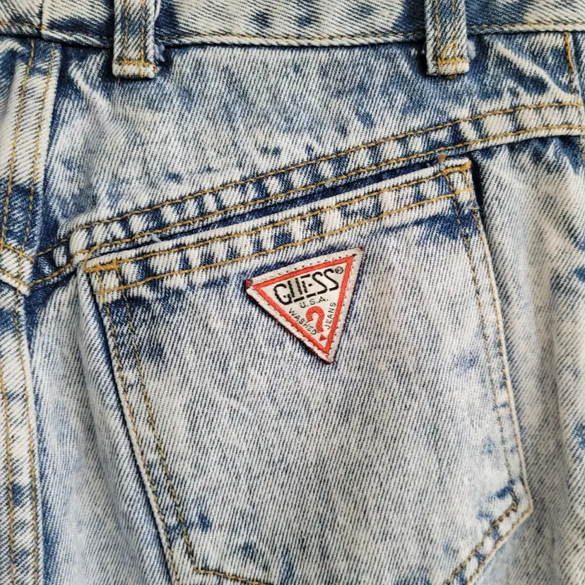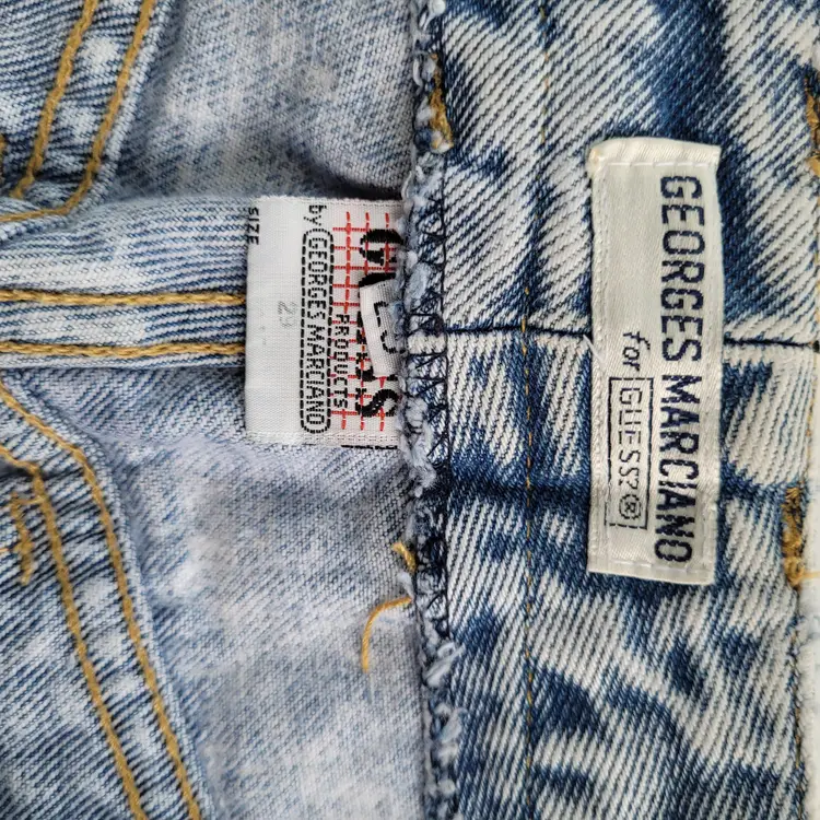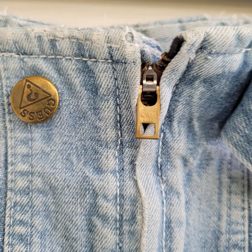 PAIR 2: This second pair is unusual. I believe they are older than the other style. They are a light weight denim material. Very high waisted with a large metal Talon zipper up the front. there is a flap that goes over the zipper and buttons at the top of the jeans. There are very large front pockets with a square Guess tag. No pockets in back. These are also acid wash. They do have wear but they are perfectly wearable. The material is getting fairly thin along the seams in some spots. Might want to patch under the spots to prevent any rips in the future. I can no longer see the size on the tag but they are similar to the other pair. There is some wear along the very tip top of waistband with loose threads here and there.