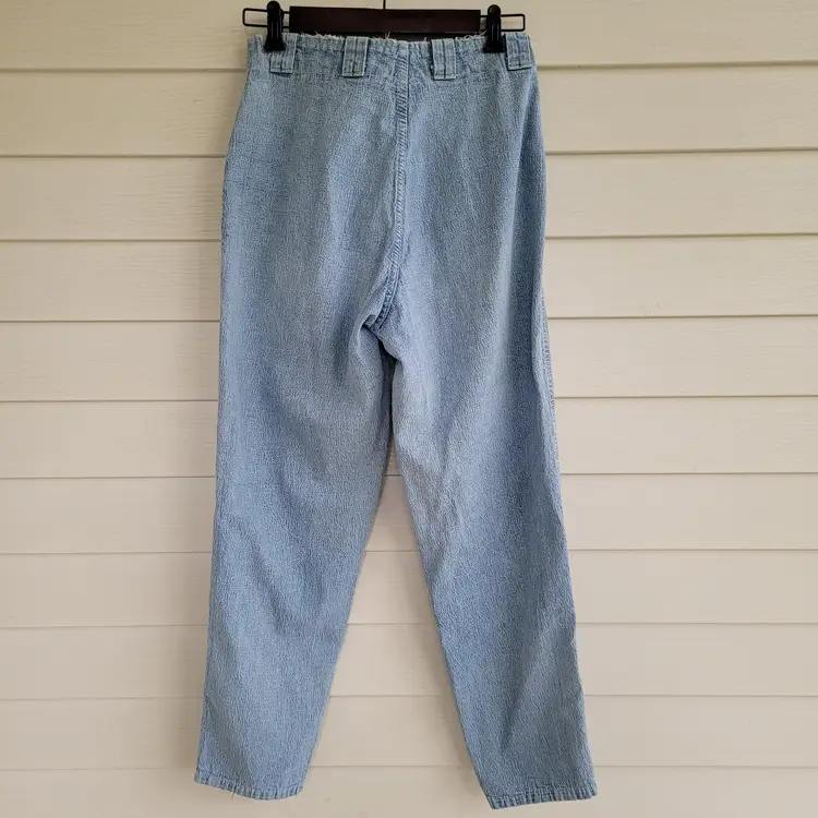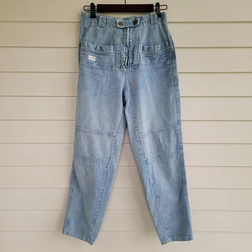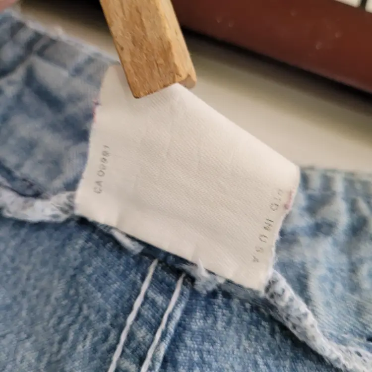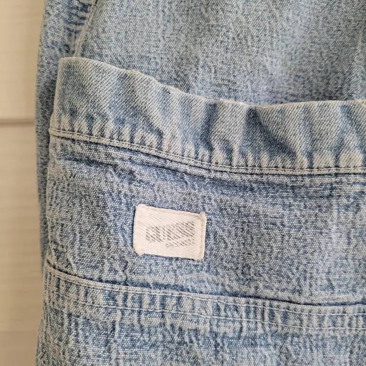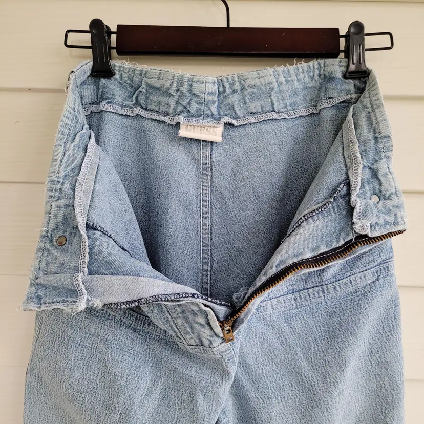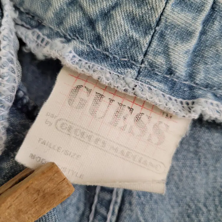 PAIR 2: This second pair is unusual. I believe they are older than the other style. They are a light weight denim material. Very high waisted with a large metal Talon zipper up the front. there is a flap that goes over the zipper and buttons at the top of the jeans. There are very large front pockets with a square Guess tag. No pockets in back. These are also acid wash. They do have wear but they are perfectly wearable. The material is getting fairly thin along the seams in some spots. Might want to patch under the spots to prevent any rips in the future. I can no longer see the size on the tag but they are similar to the other pair. There is some wear along the very tip top of waistband with loose threads here and there.