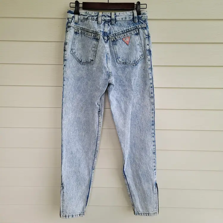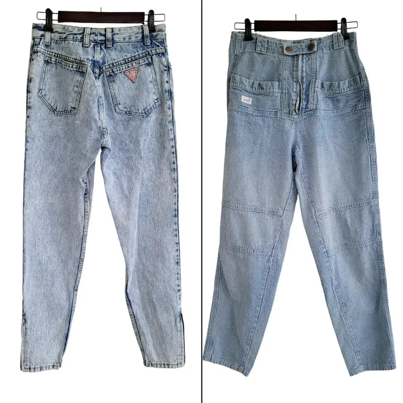 PAIR 1: High rise acid wash jeans with zipper up ankle sides Tagged a vintage size 29. 100% Cotton. Metal Guess zipper up front with button at top. These are in nice condition.