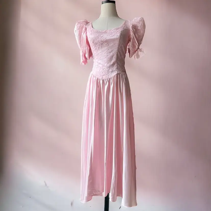 Killer and perfectly 80s sheeny coral pink maxi prom dress. Features scoop neckline, fitted bodice with floral lace overlay and princess cut seams. Incredible short, rouched puff sleeves with tapered point and bow detail. Gathered, full length satin skirt, zipper in the back. No size tag - please refer to measurements below for accurate fit. Excellent vintage condition. [measurements] Shoulders: 14 in Sleeve: 11 in Chest: 30 in Waist: 25 in Length: 47 in !Please note! when buying vintage that these items are pre-loved! Isn’t that cute? Most vintage items show signs of wear, which is what makes them so special. I do my best to photograph, note anything visible such as stains, rips or holes in the item description. But please be aware that all vintage items will usually show a few signs of wear or slight fading due to age. I hope to find these unique items their forever homes, so if you have any questions about an item or need guidance with sizing, please contact me! I’d love to help! SHIPPING