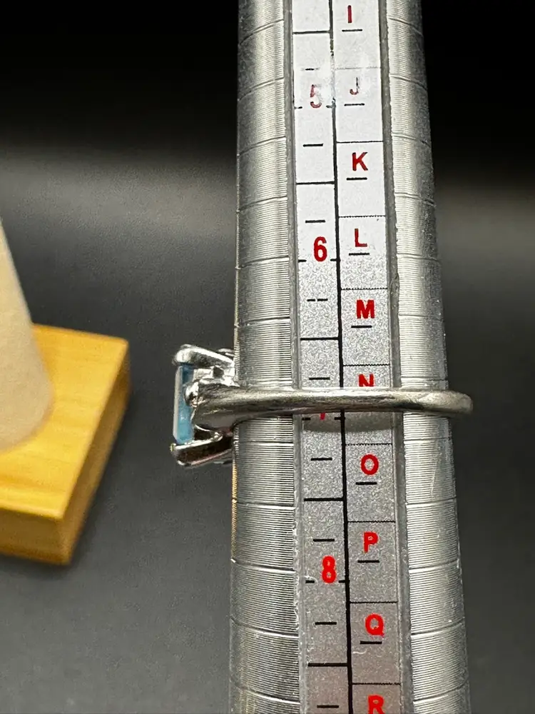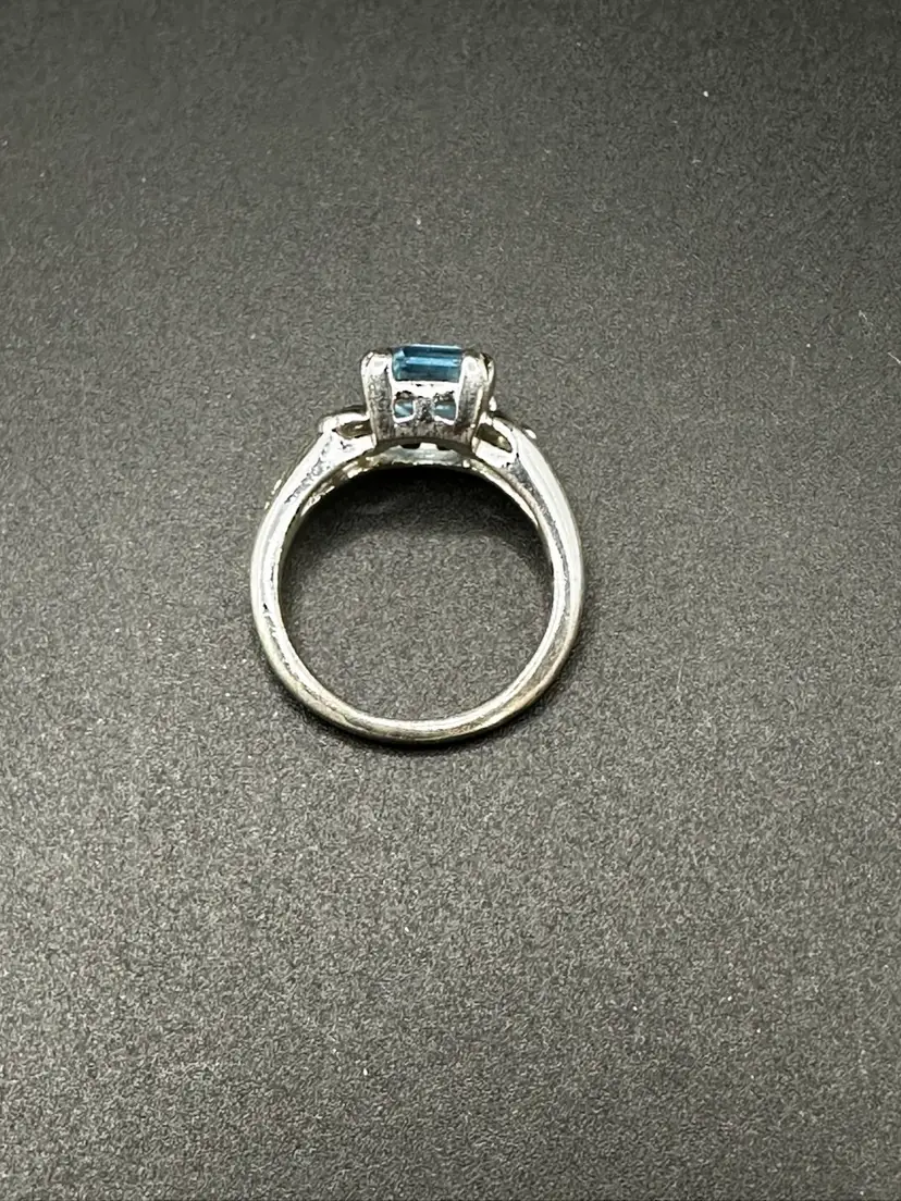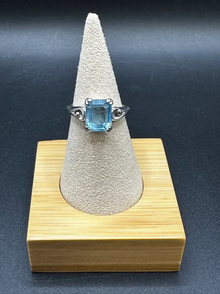 43 - Avon Blue Ice Emerald Cut Faux Topaz Ring Silver Tone Size 7