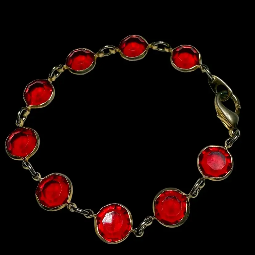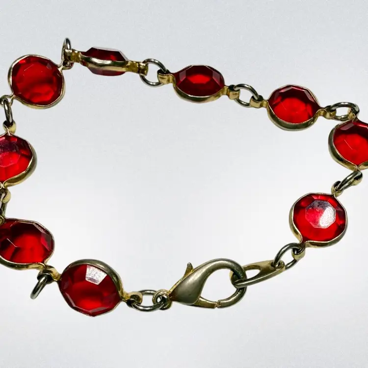 8.25” bracelet lined with ruby red (faux ruby) stones. Metal is gold toned. Metal finish is slightly worn/dulled. No major issues otherwise!