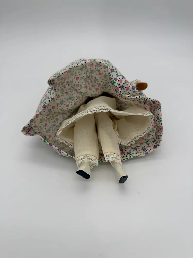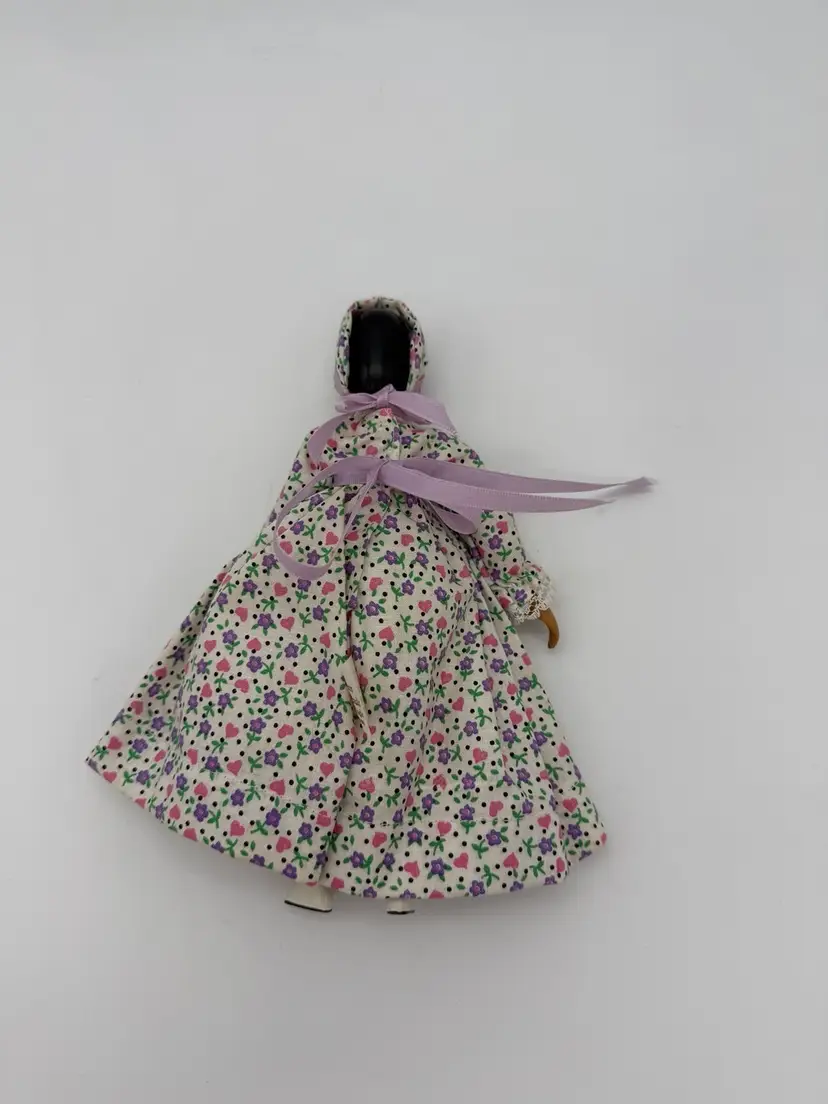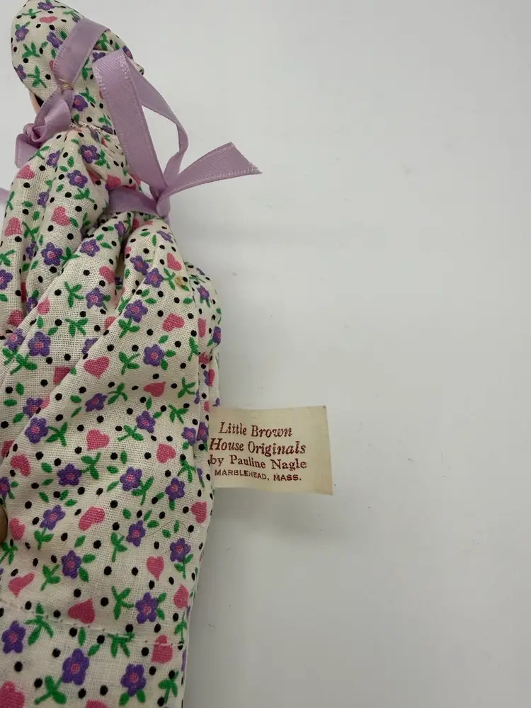 The product is an 8.5” rare and a one-of-a-kind vintage Hitty doll made of wood, hand painted with black hair, and signed by artist Pauline Nagle in 1976. This rare and original artist doll from the Little Brown House brand features handmade, hand-stitched clothing with hearts, and flower patterns on her dress, and is part of the Pauline Nagel collection. The doll, with a light complexion and black eyes, is a unique piece for collectors and enthusiasts of vintage dolls, especially those interested in the Little Brown House franchise.
