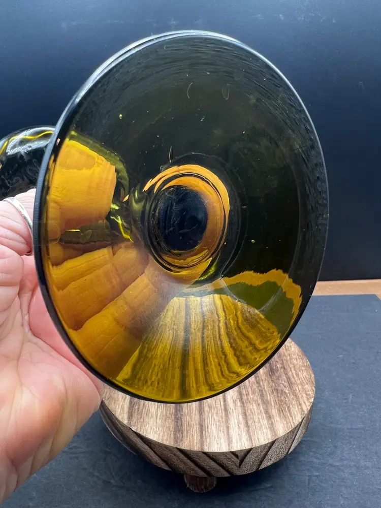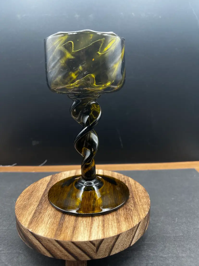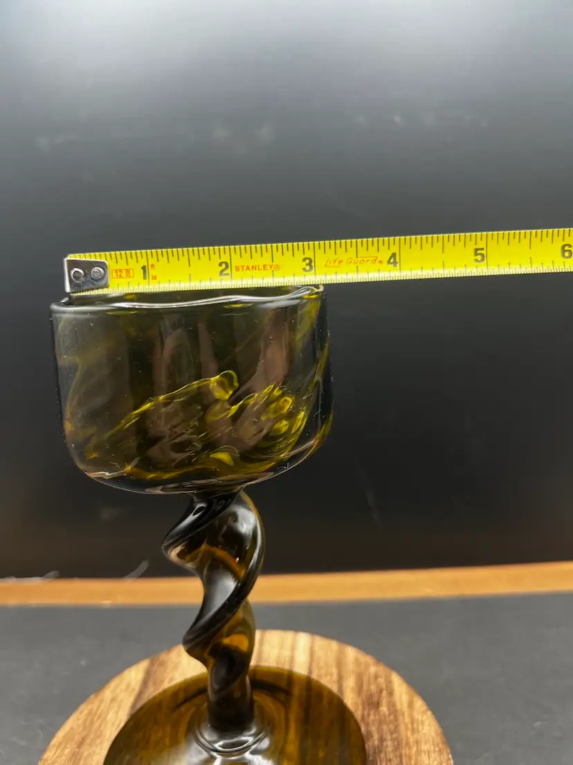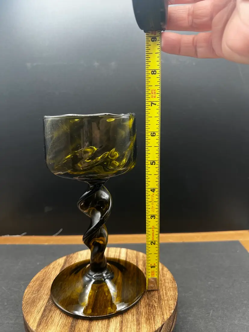 Vintage MCM Empoli Optic Olive Green Art Glass Twisted Stem Italian Candle Holder In very good condition no chips or cracks Just over 6 1/2” tall x 3” in diameter