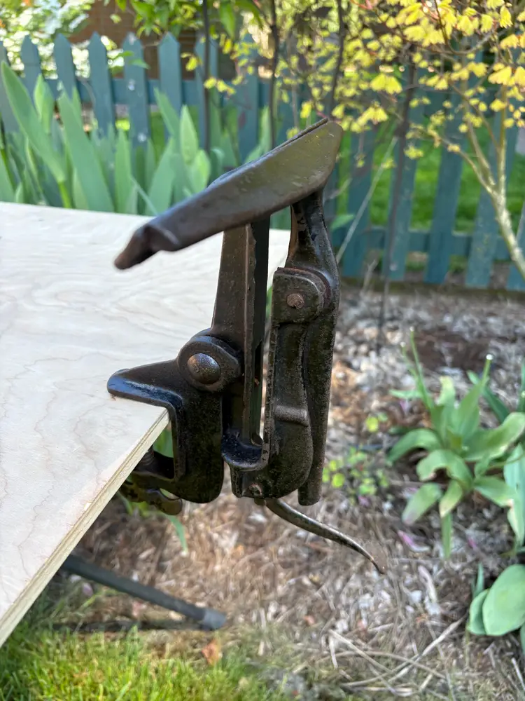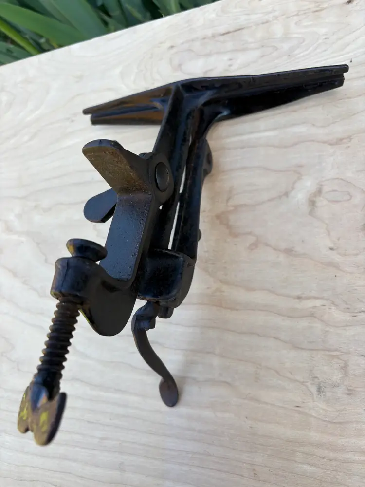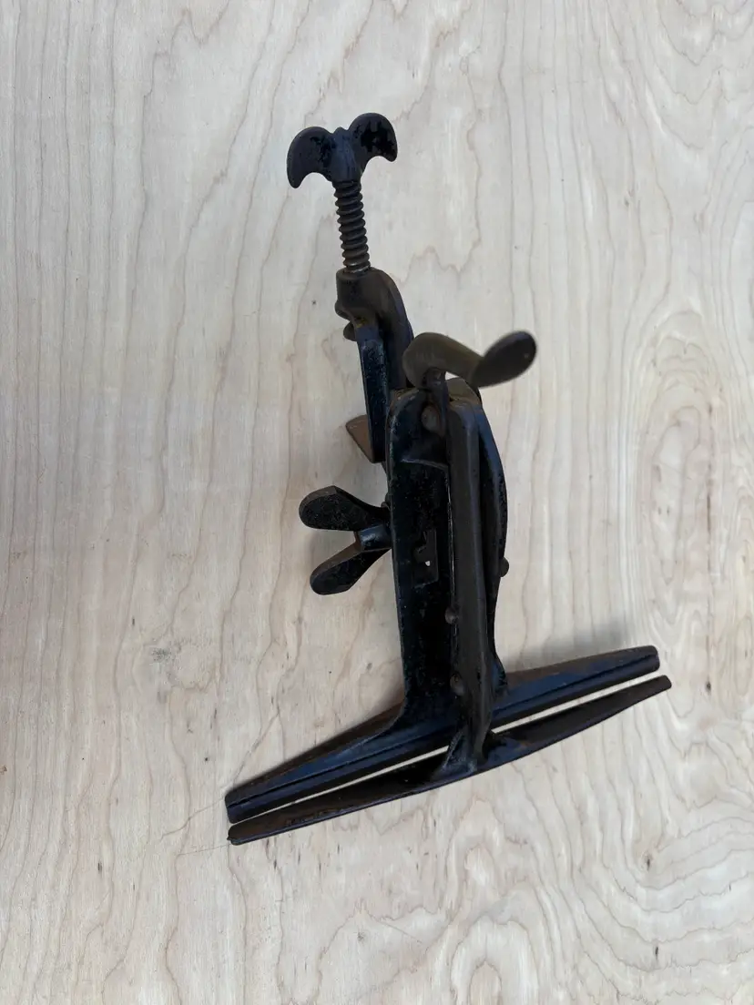 Unmarked 9 1/2" wide saw vise. Looks to similar to a "No 3" made by Sargent. Clamps to bench and has a tilt adjustment. Ends of the jaws fully close. All parts move freely. Clamp opens to 2".