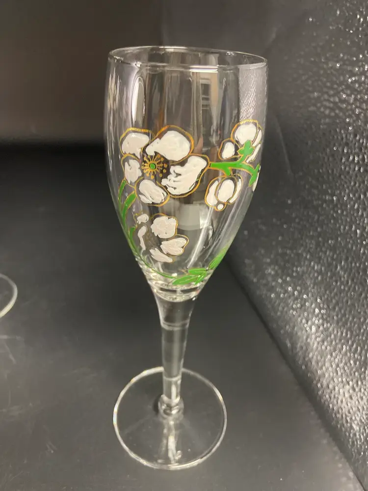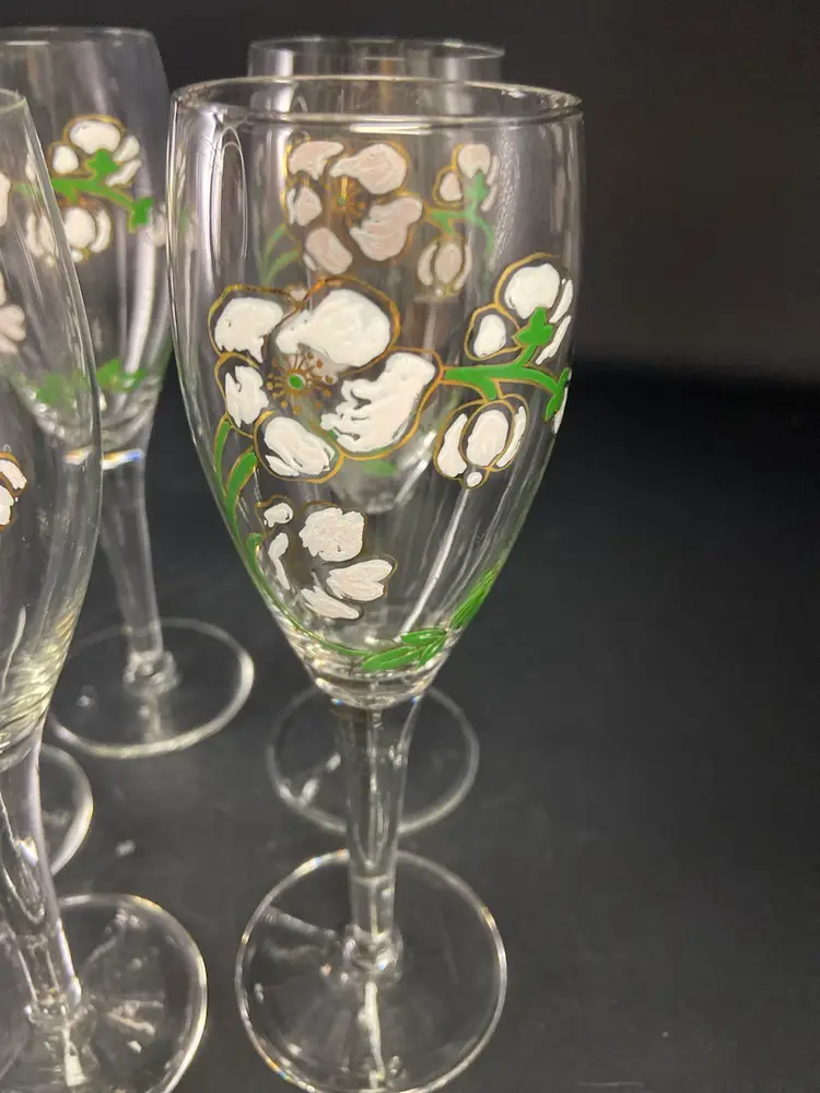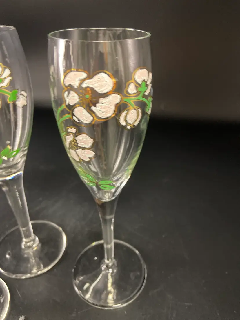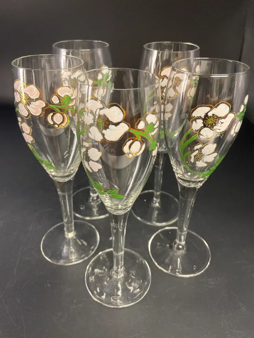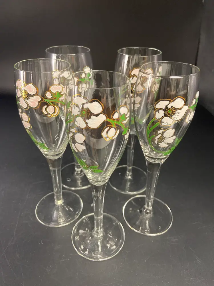Perrier Jouet Champagne glasses, anemone flower belle epoque, vintage. Vintage pair of champagne toasting glasses , Art Nouveau design from Emile Galle circa 1900's design. 7.5 inches tall.