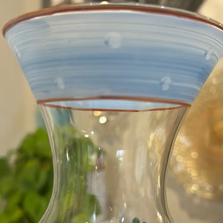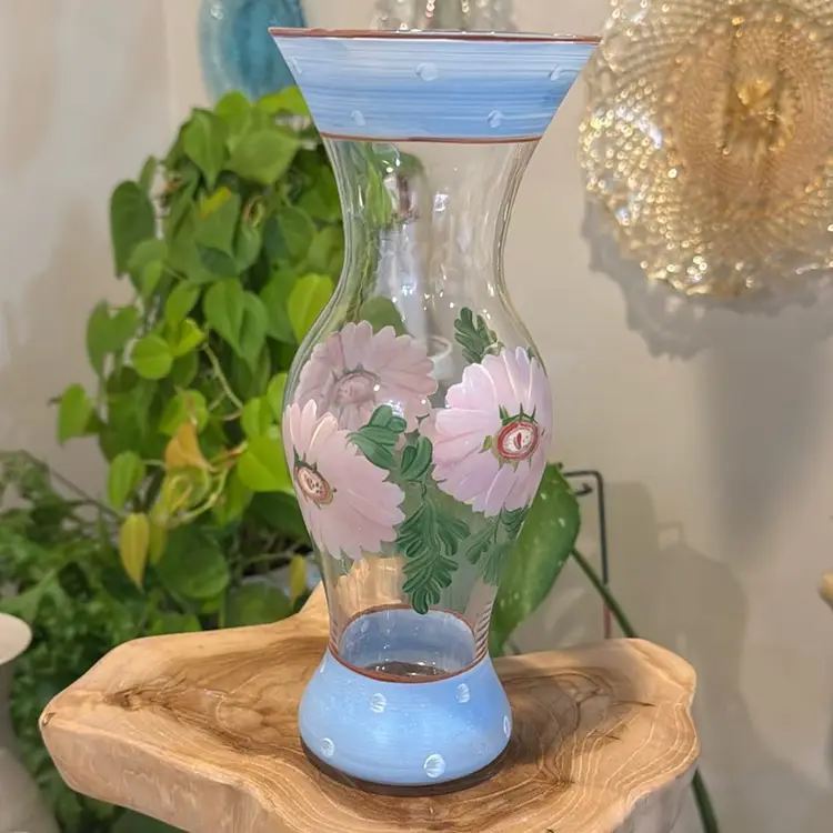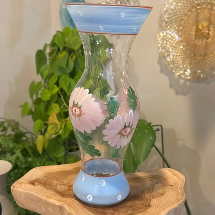 Beautiful springtime hand painted floral base. Pink flowers with blue and white polkadot trim. 9 inches tall. No chips and no cracks.