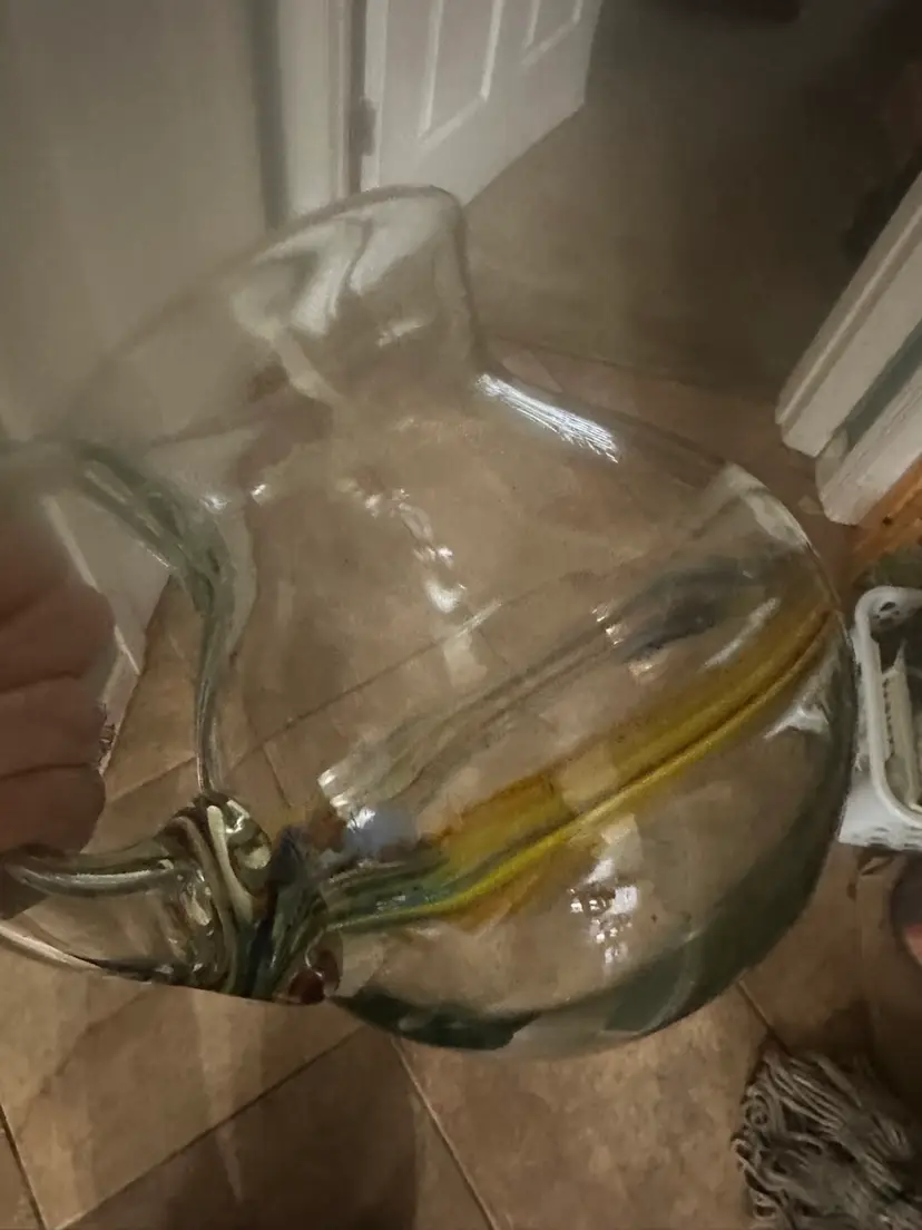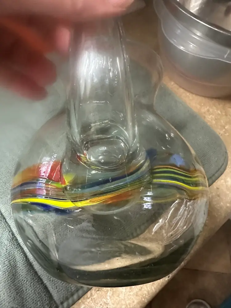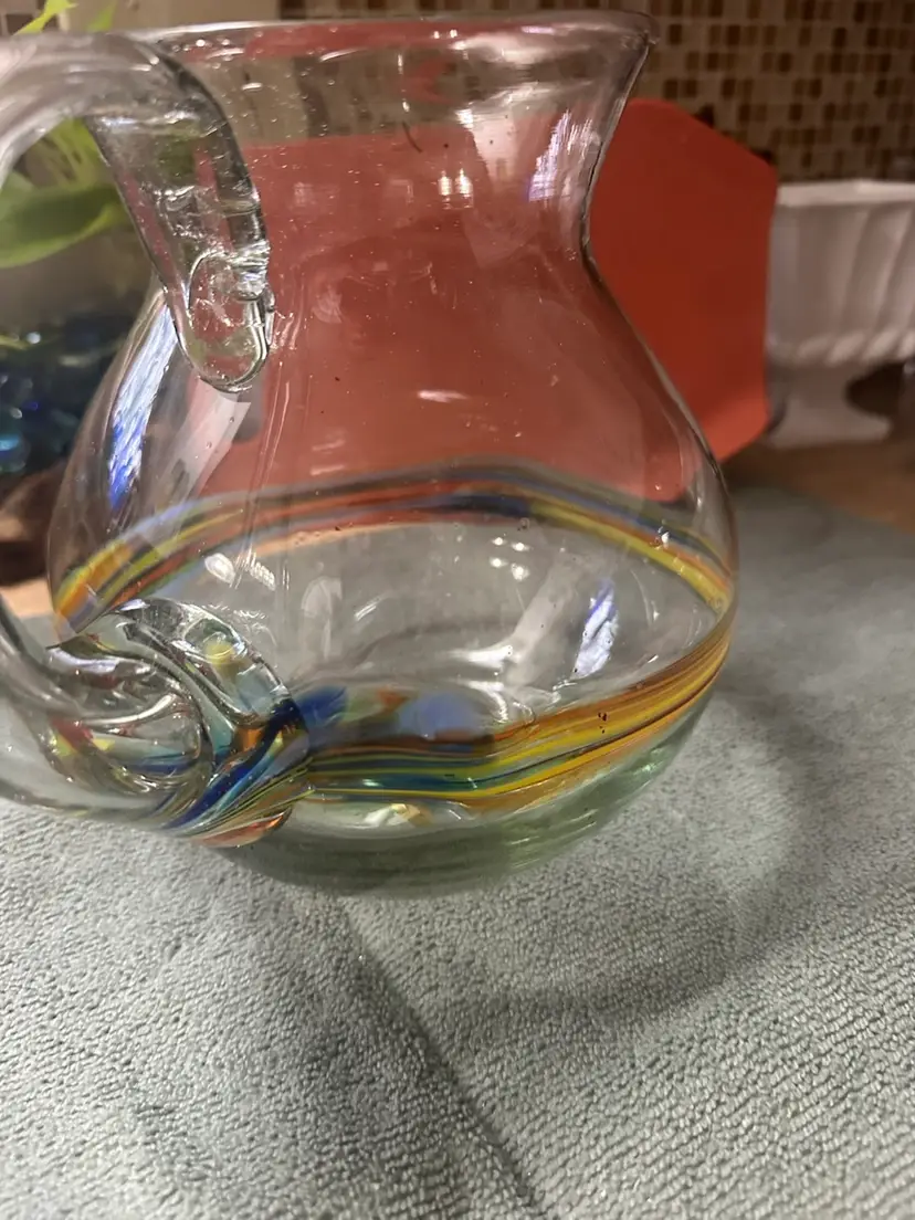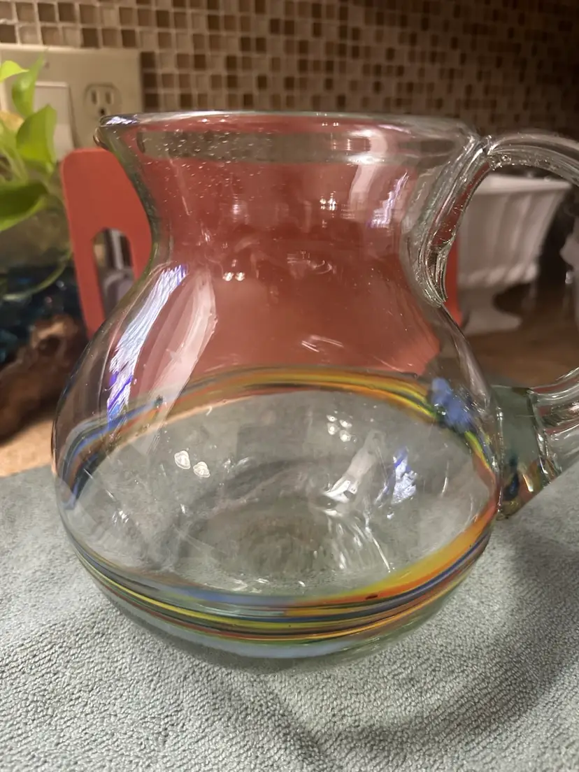 This 9” handblown clear glass pitcher adorned with vibrant orange, blue, yellow, and red ribbons makes a striking statement in any kitchen or dining room. The artisan "Marble" design adds a unique touch to the pitcher, making it a standout piece for serving beverages or as a decorative accent. Crafted from glass, this pitcher adds a touch of elegance and creativity to your home decor. Its eye-catching colors and intricate ribbons make it a standout piece for those who appreciate artistic and colorful pieces in their kitchen or dining room.