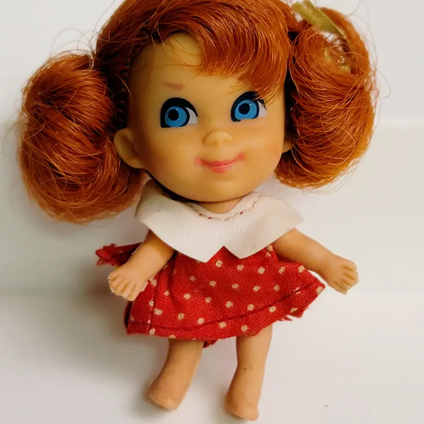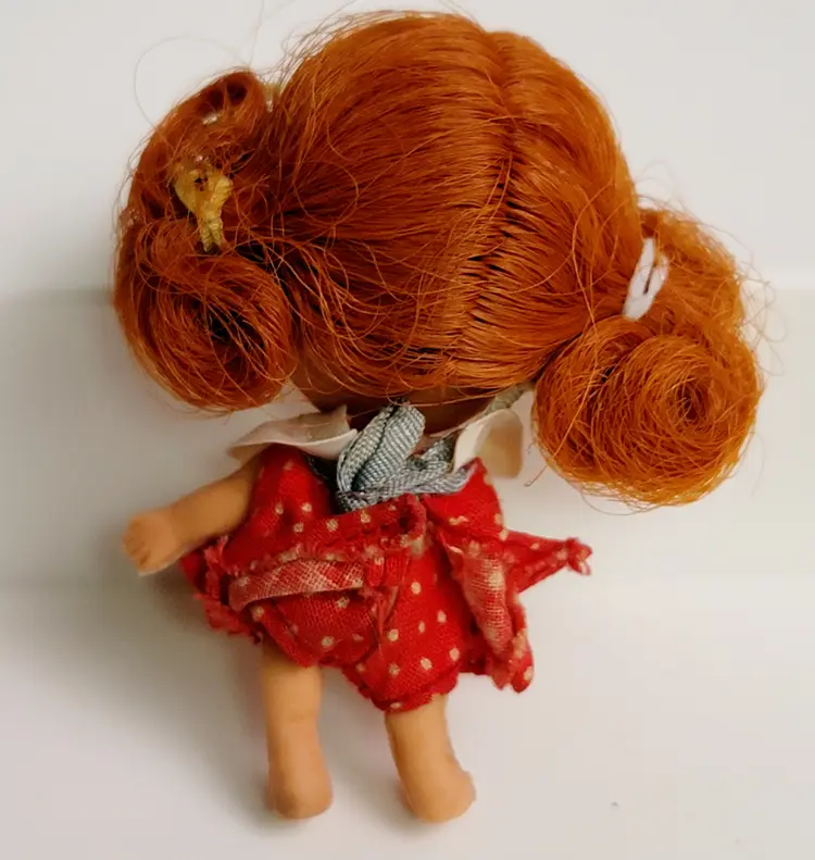 1960s Mattel Little Kiddle's doll. 2.5-3.5" tall. Vinyl/rubber with posable legs. The doll may show wear consistent with age, such as discoloration, holes in rubber feet or hands from wire. Clothing stains or fabric issues. Frizzy hair.