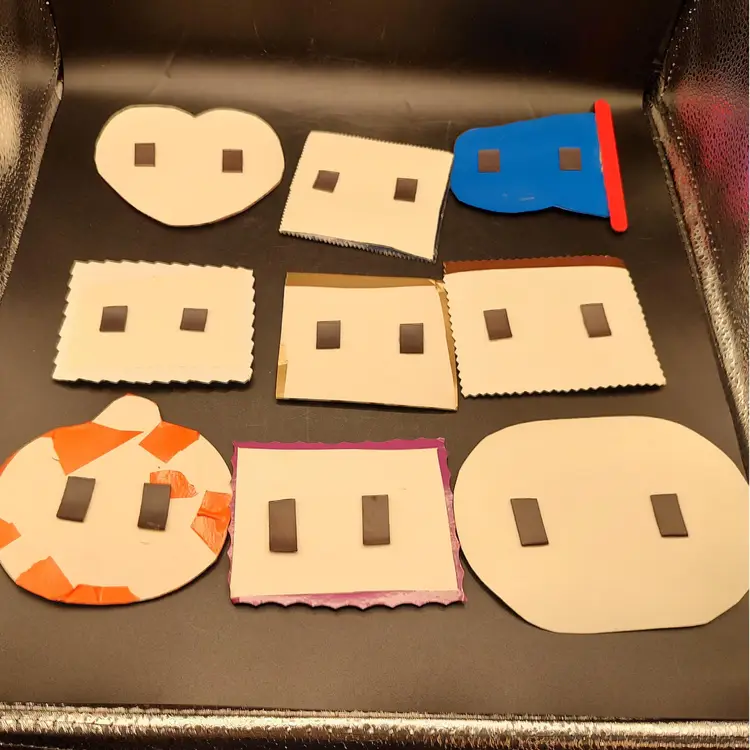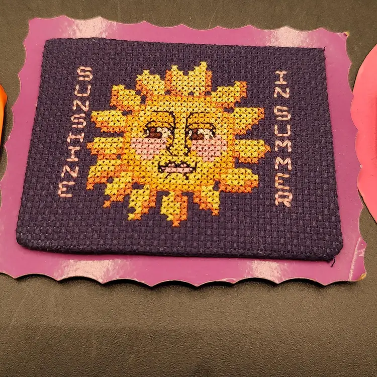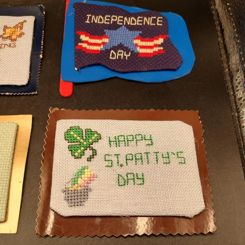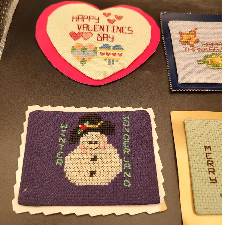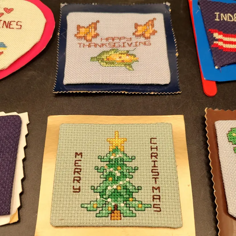 9 Vintage Cross-stitch Holiday Refrigerator Magnets, 2 Thanksgiving, 2 Christmas, 1 Summer, 1 Fourth of July, 1 Easter, 1 Saint Patrick's Day and 1 Valentine's Day. In good condition height 4"-3"/ length 5.5"-3.5". Made in Maine USA