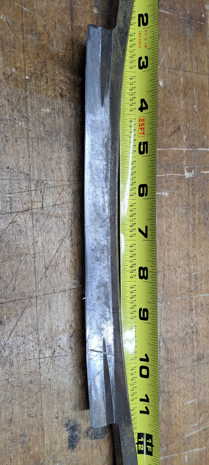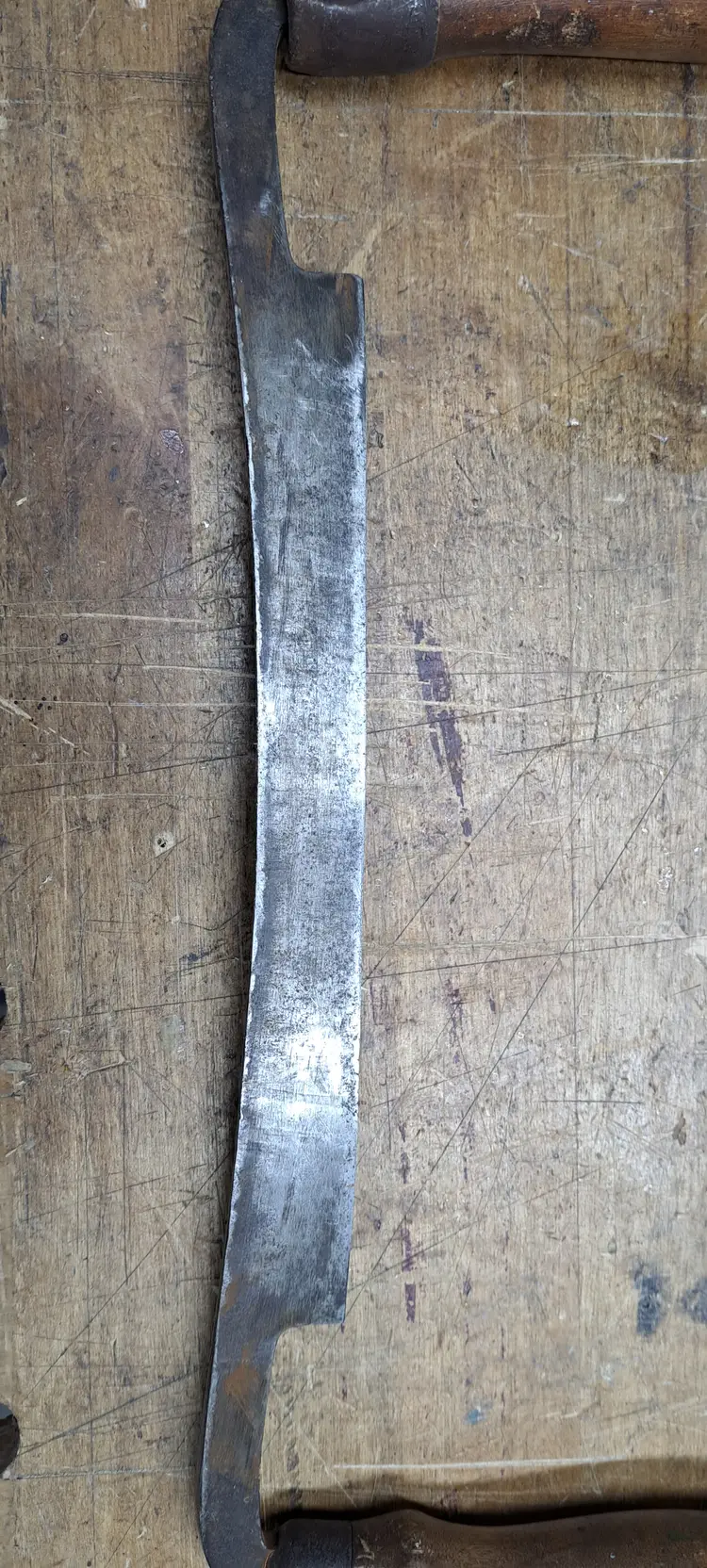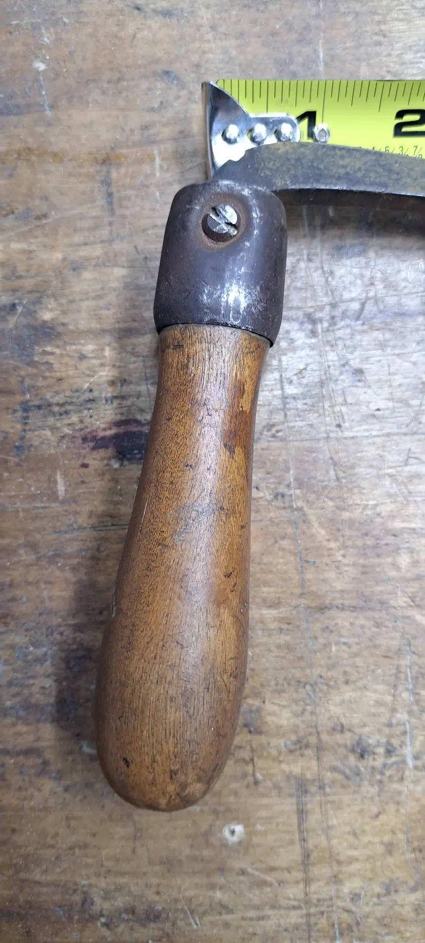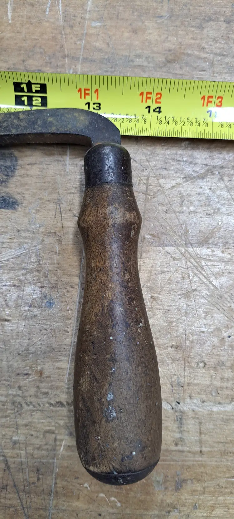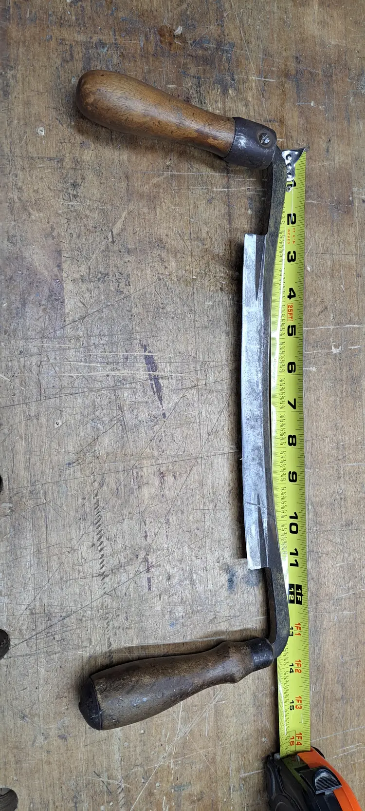 9" Warranted stamped draw knife. the left side handle is a replacement done who knows how many years ago, came this way when I got it with a large lot of tools years ago.