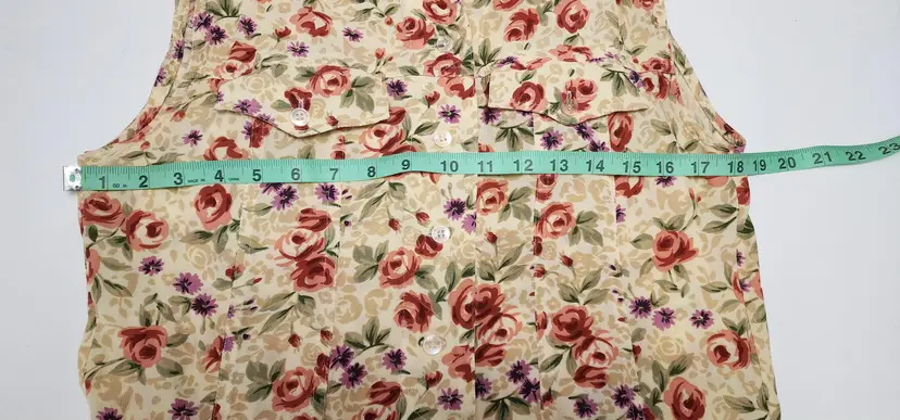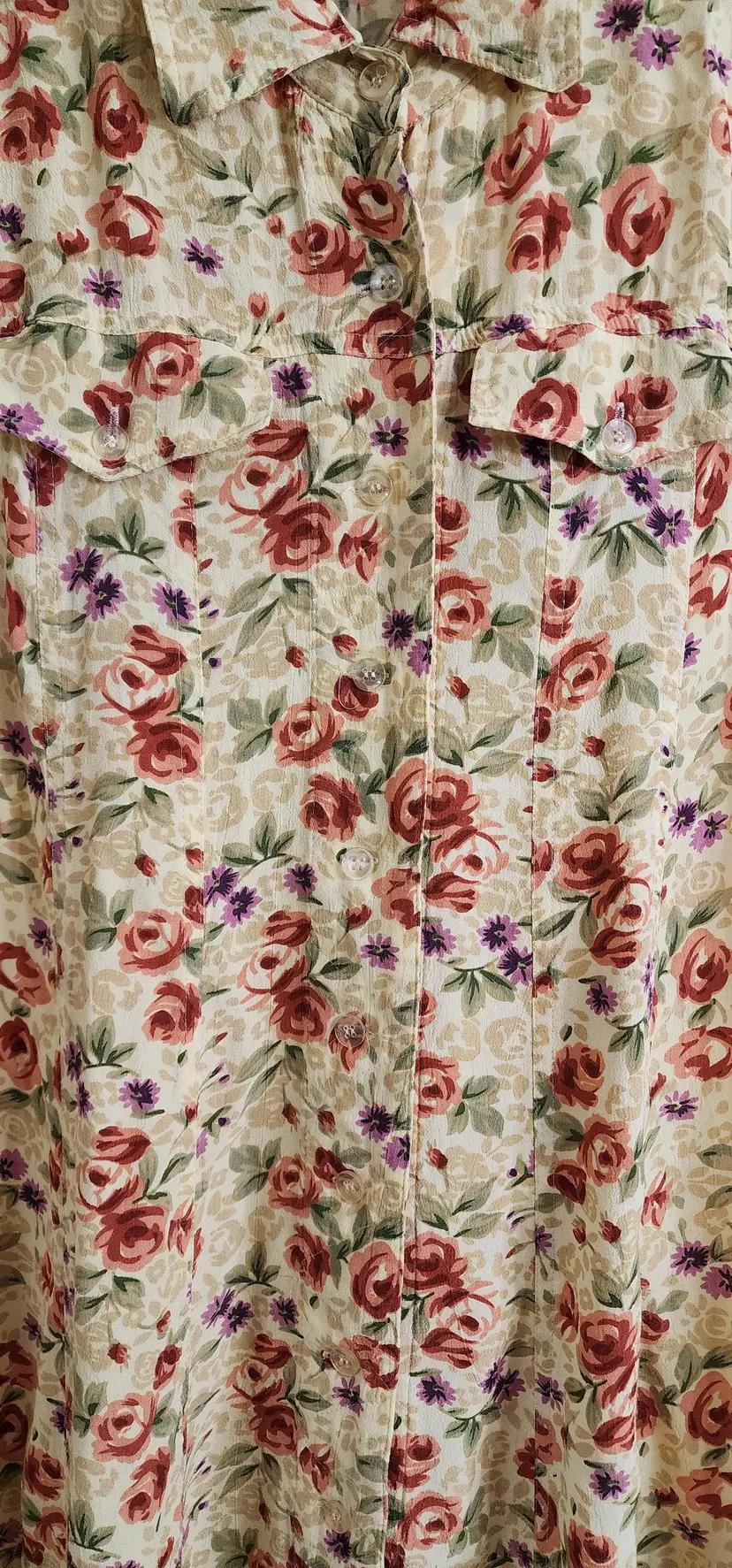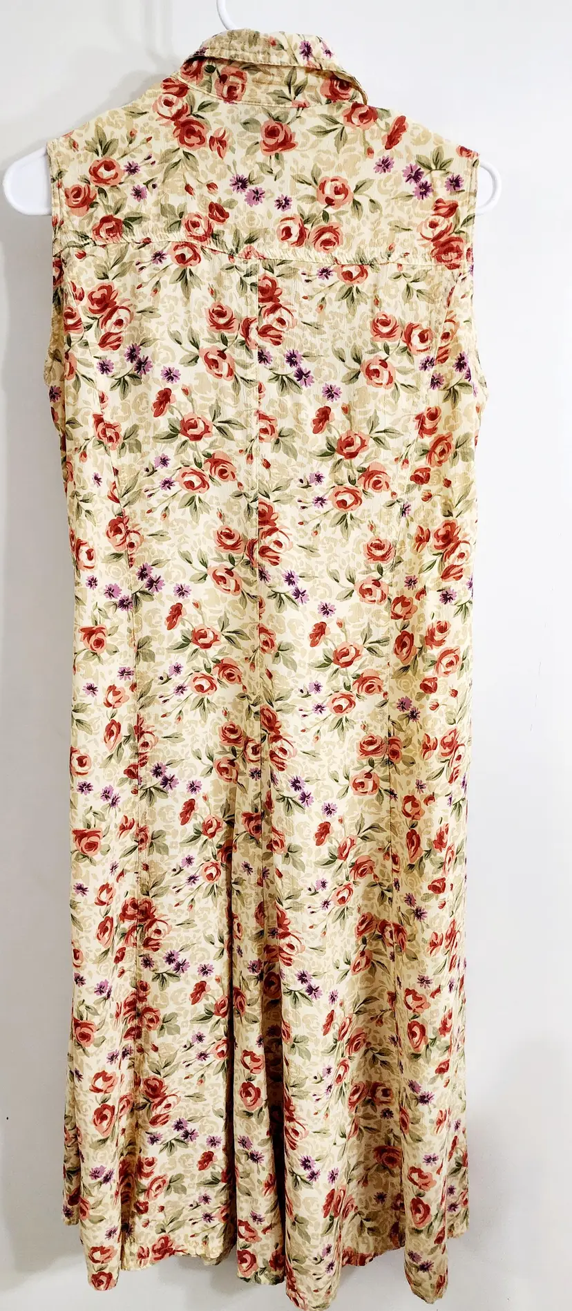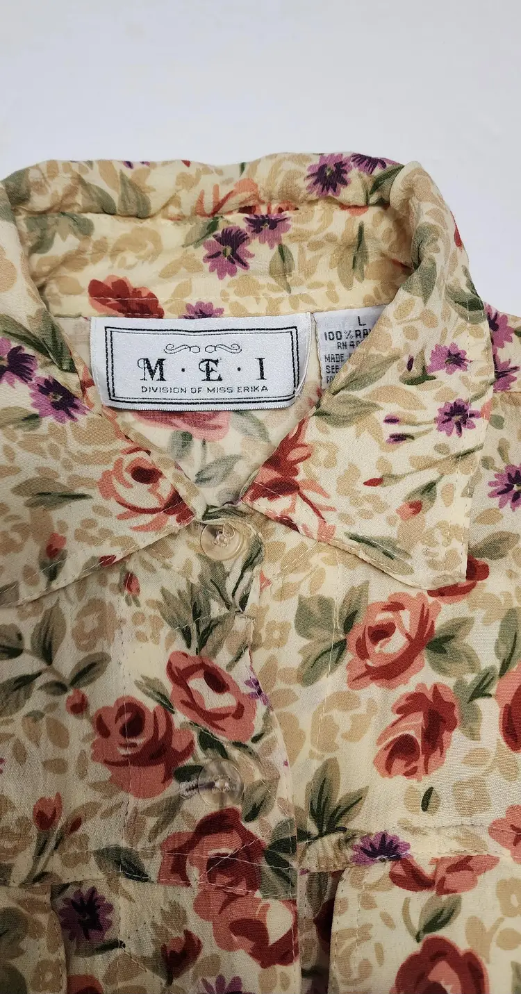 90s MEI tan background with Floral print maxi dress. Buttons down front. Great condition. Labeled Large. Flat lay measurements- Chest 18.5, length 43